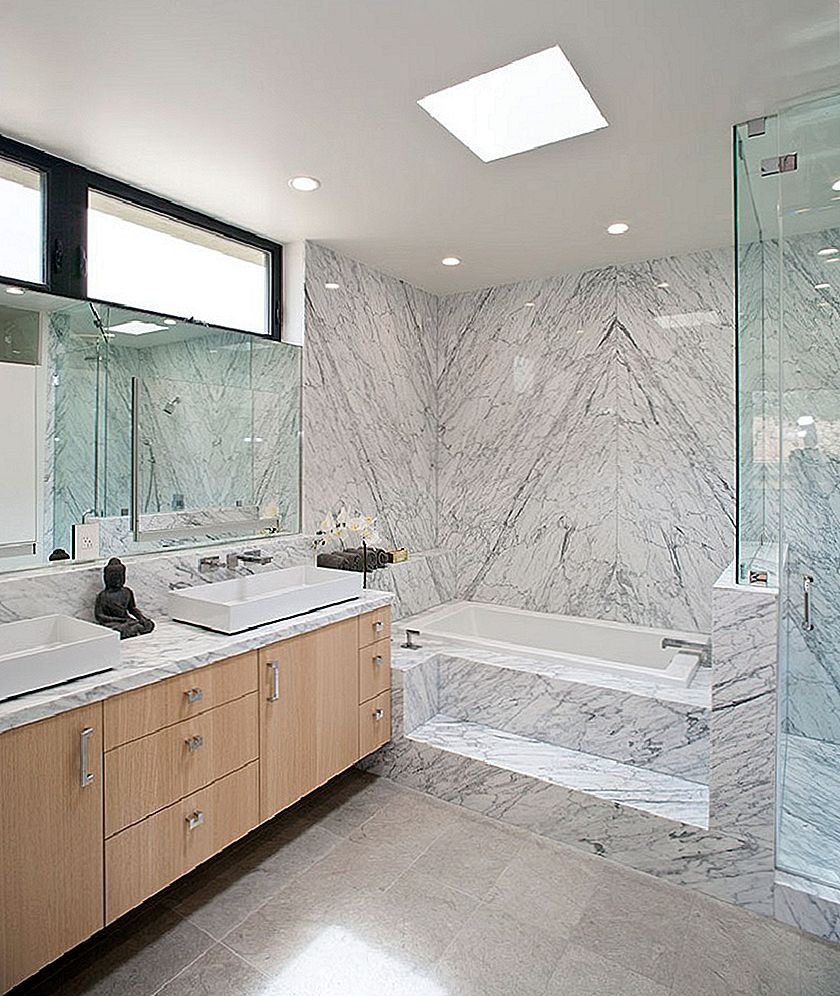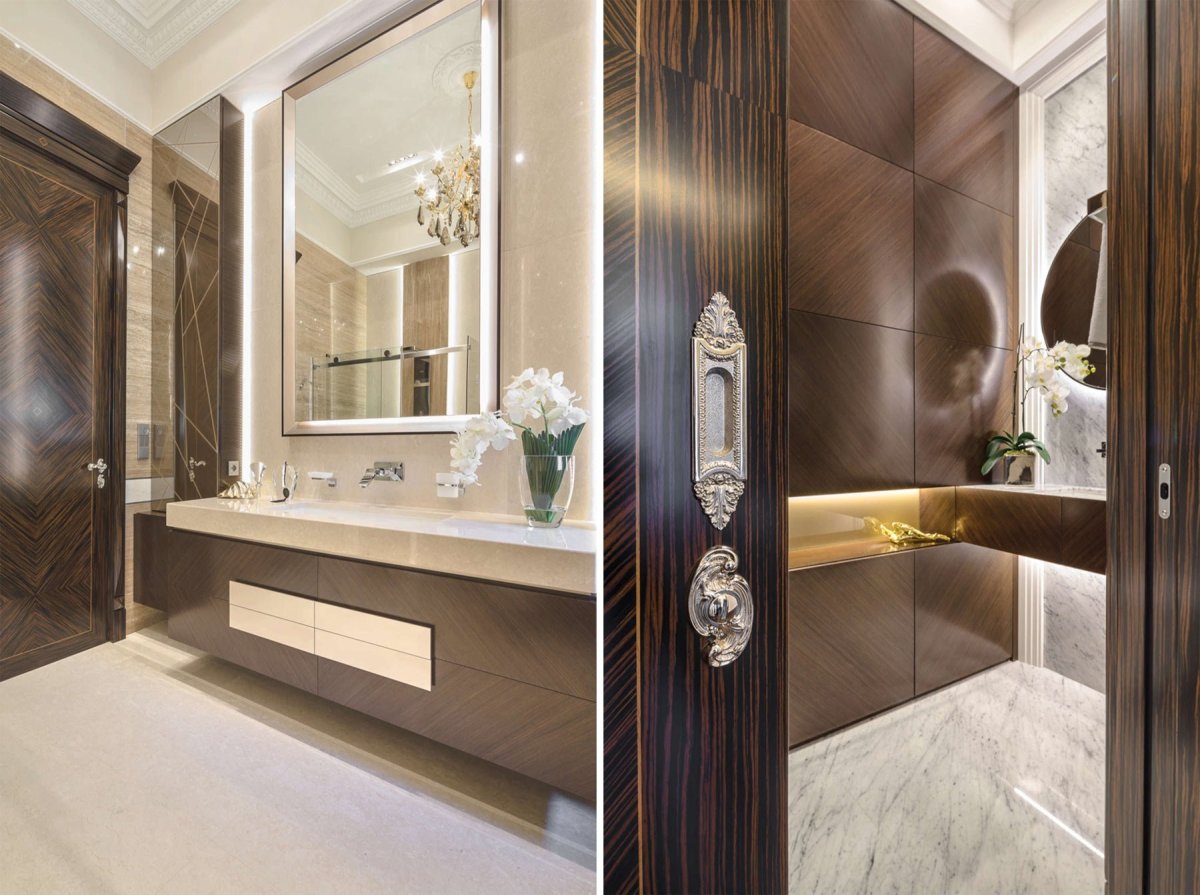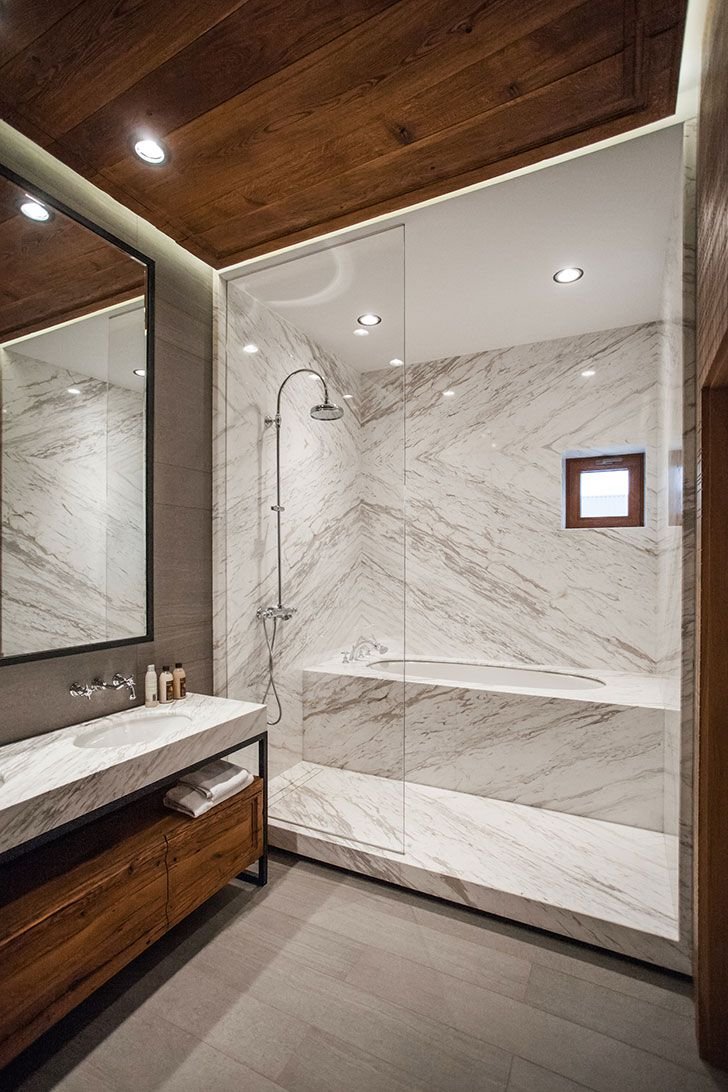 Ванная мрамор и дерево в интерьере