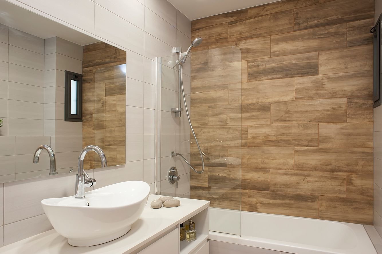 Ванная с плиткой под дерево