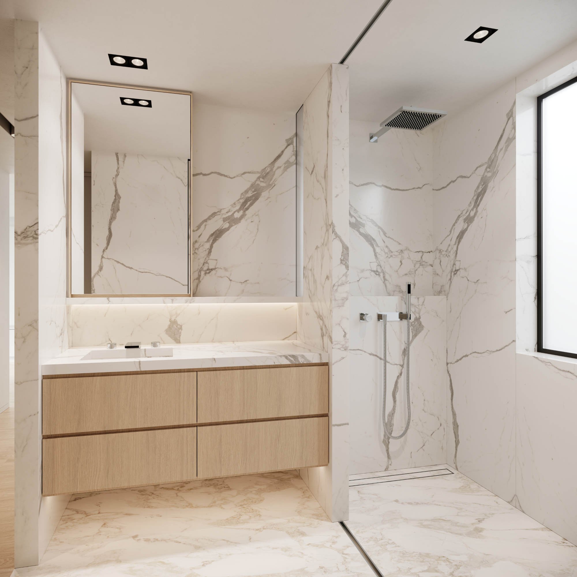 Мрамор и дерево в небольшой ванной