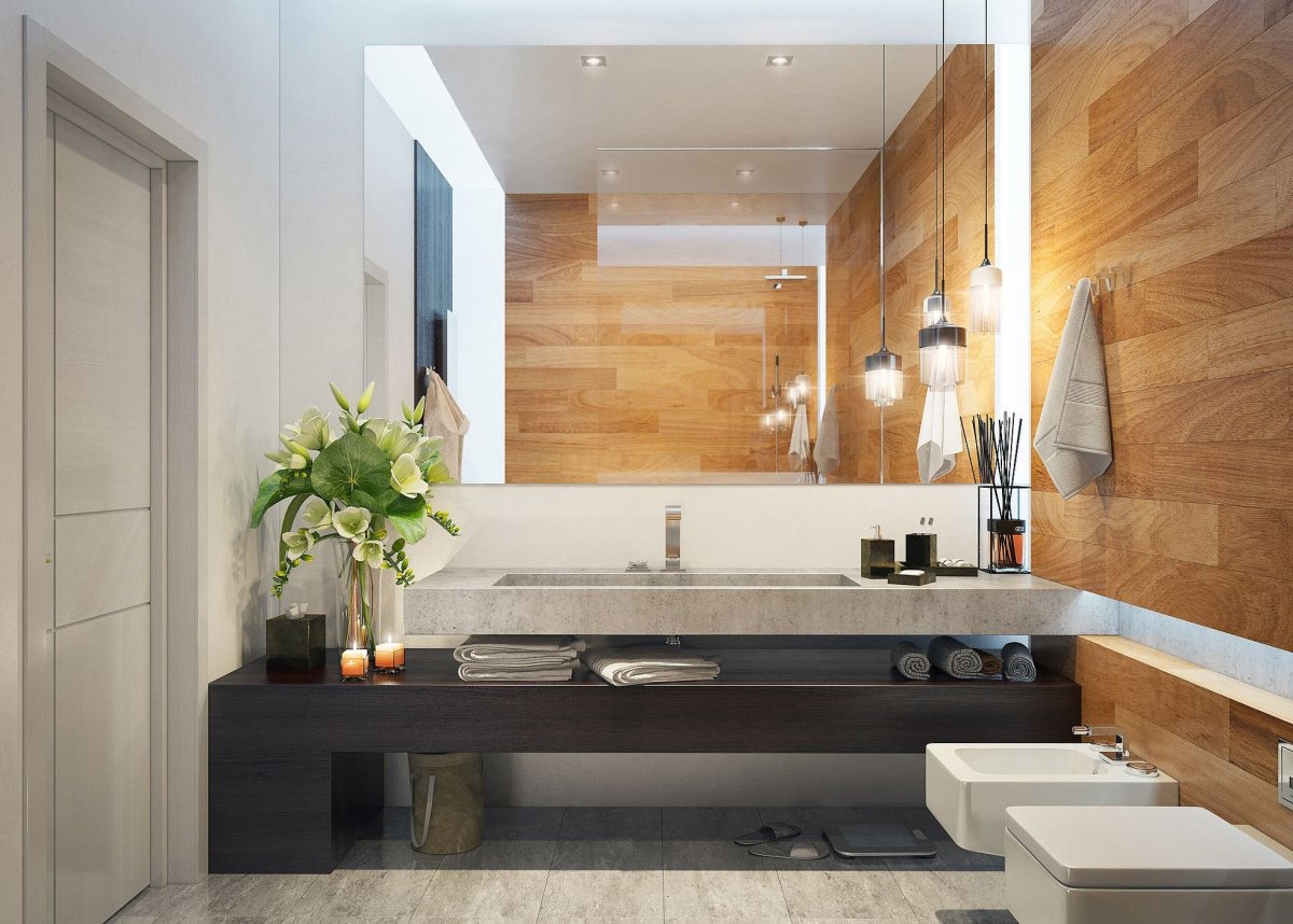 Дерево в интерьере ванной комнаты