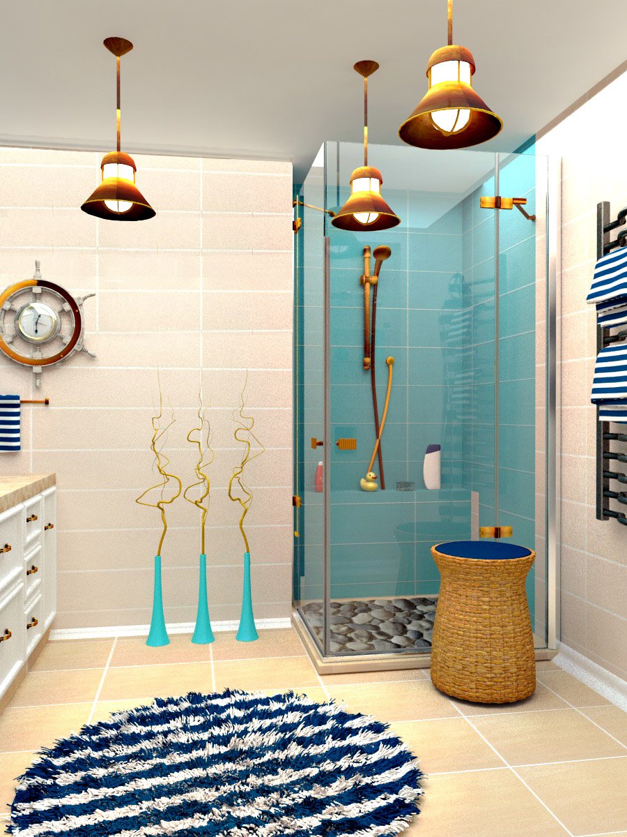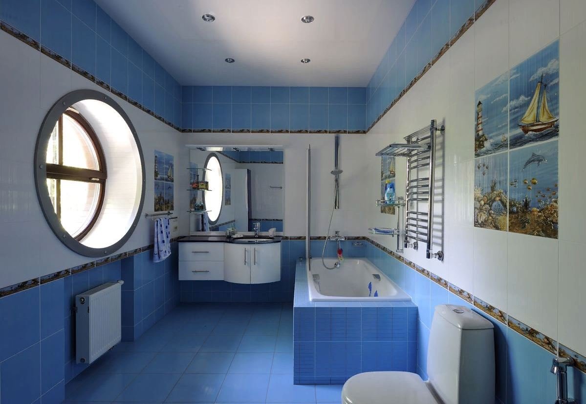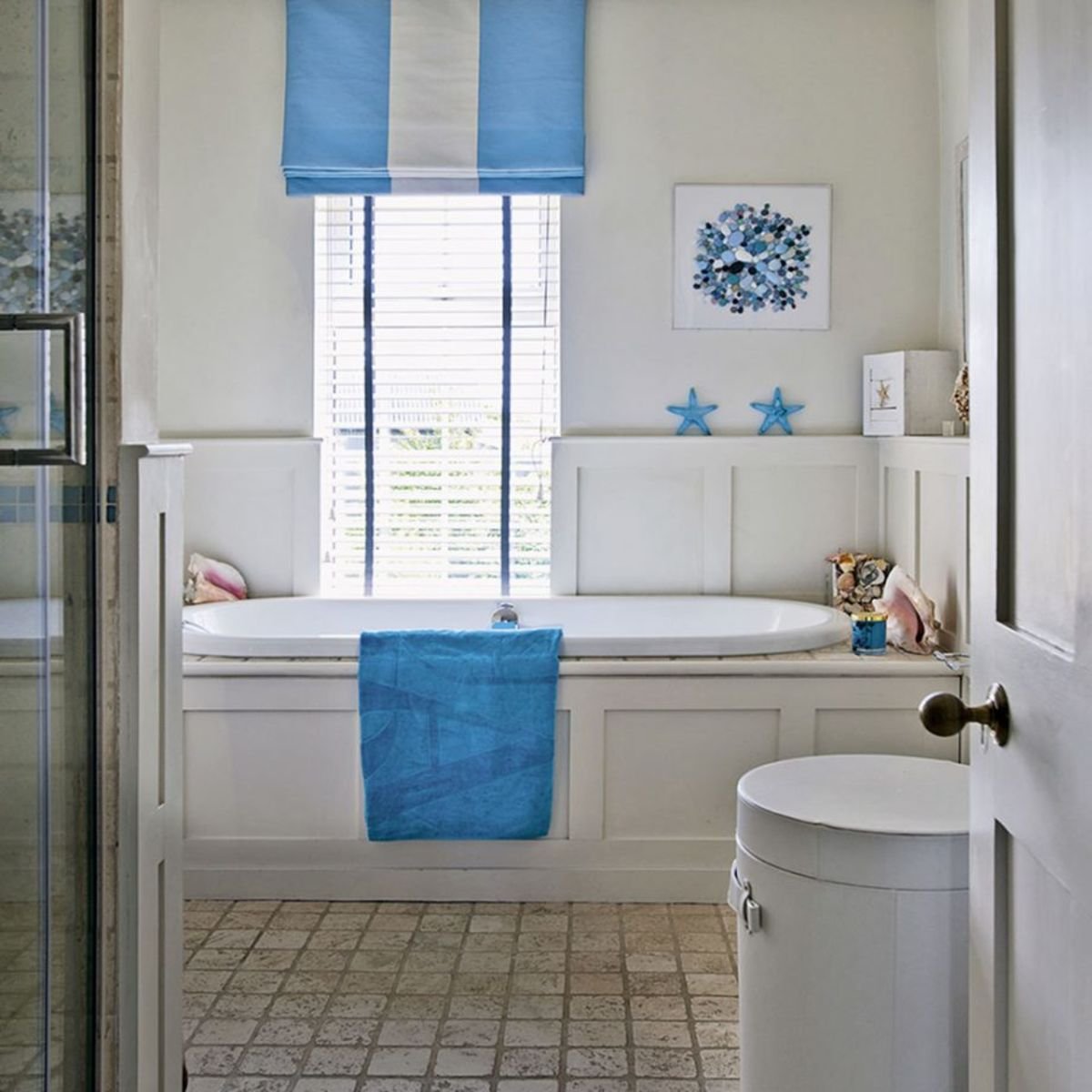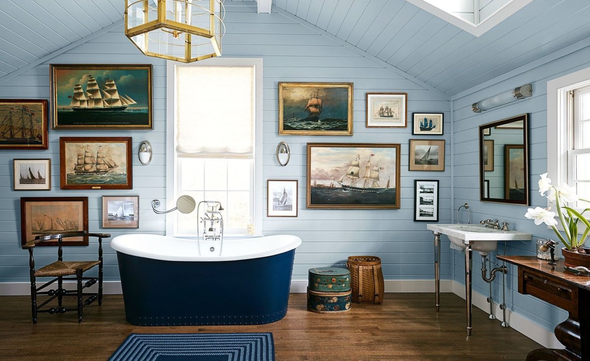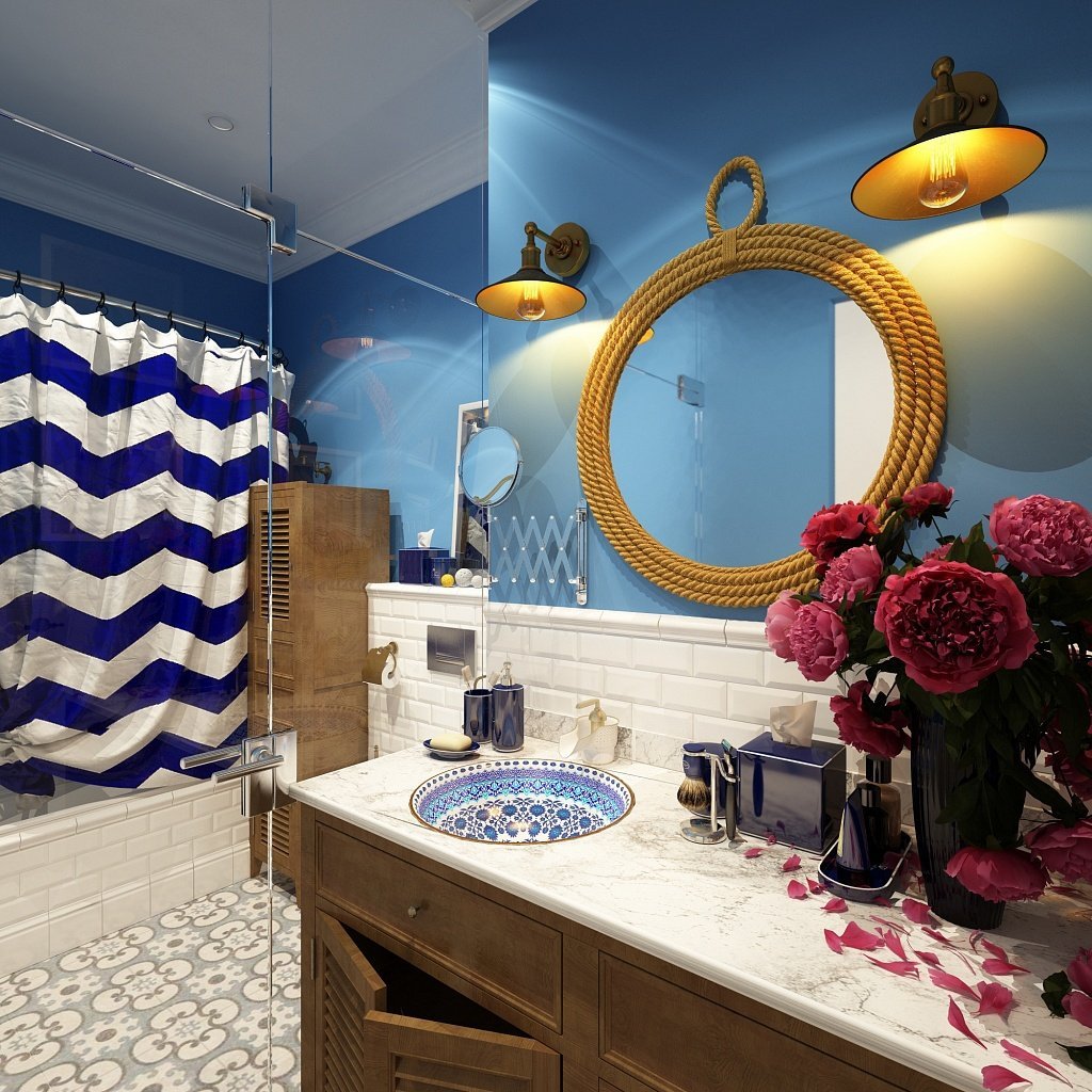 Дизайн ванной комнаты в морском стиле с угловой ванной