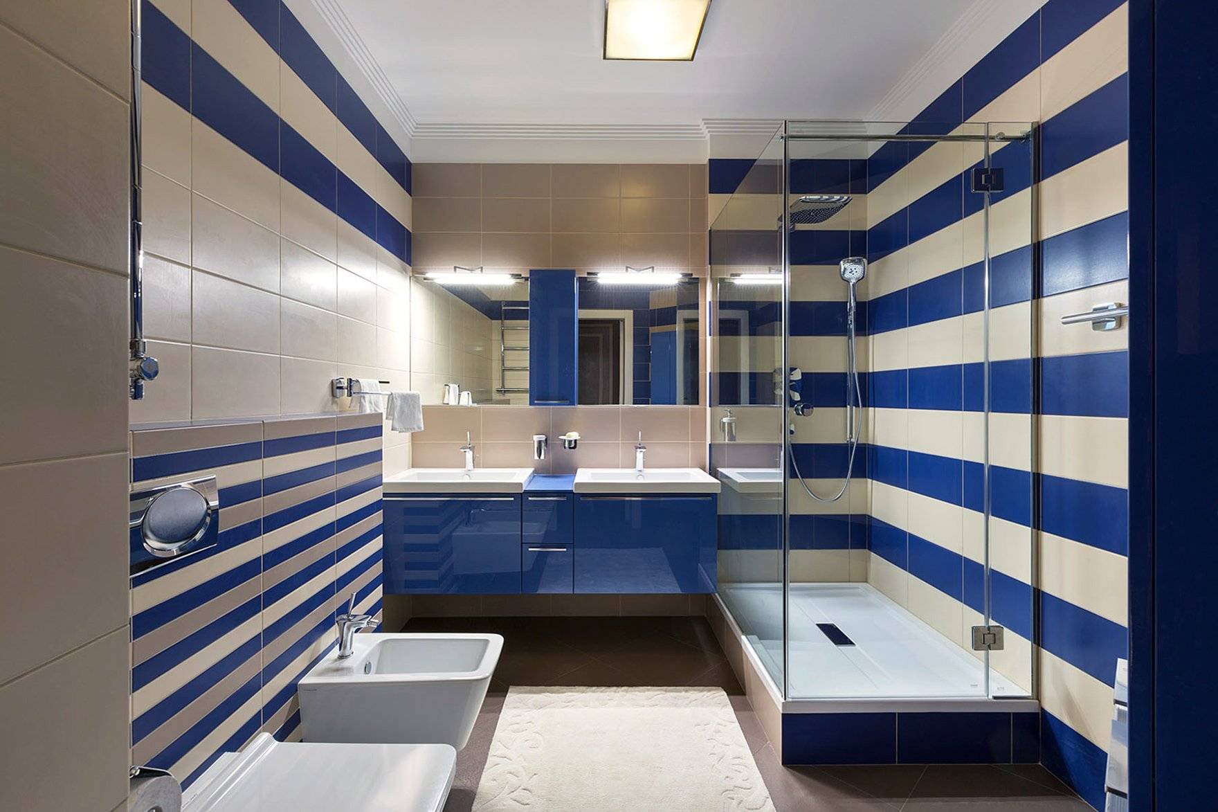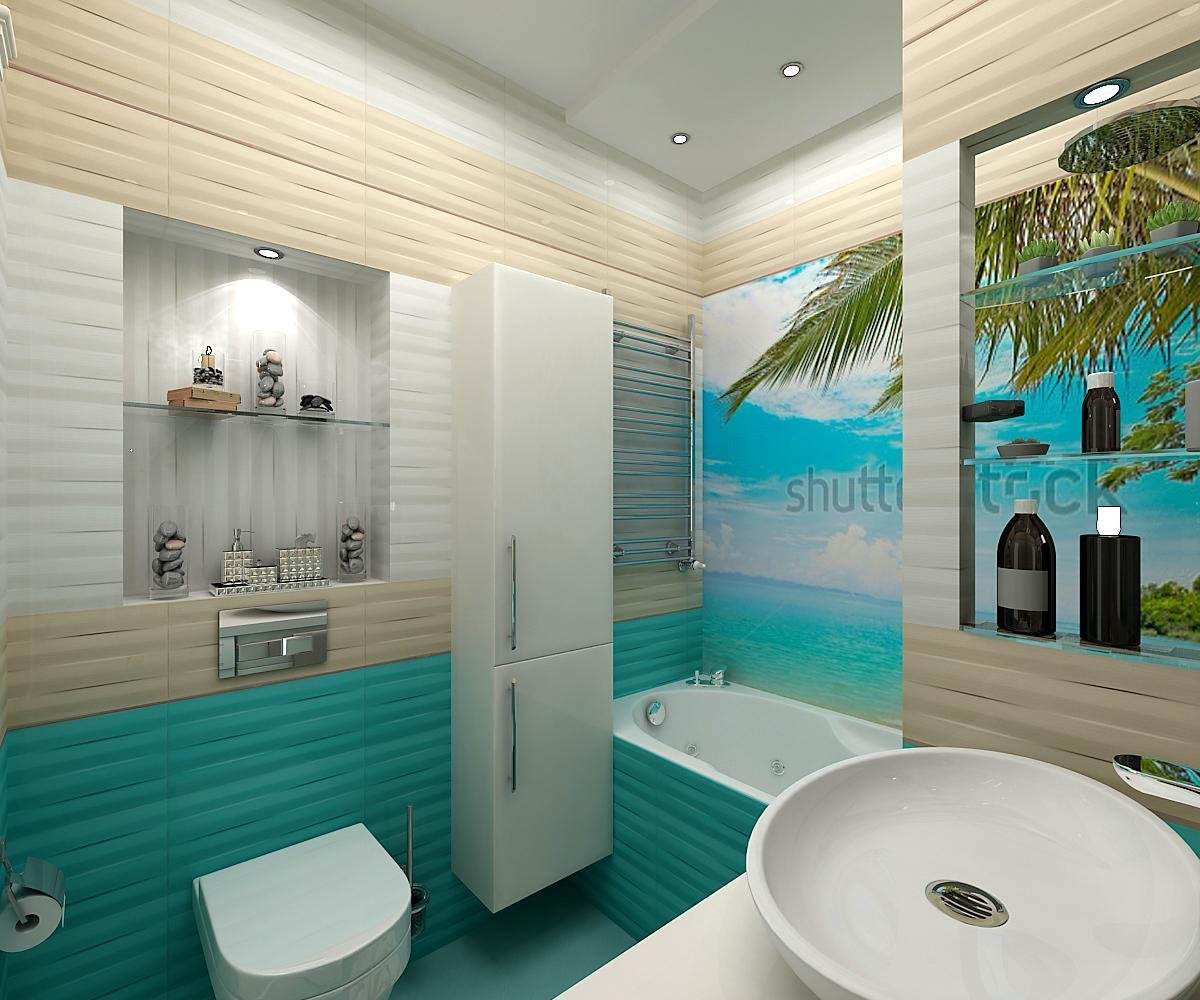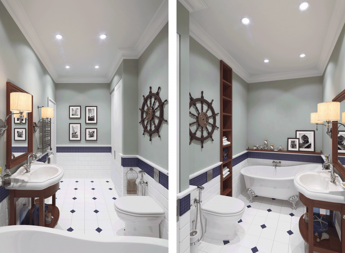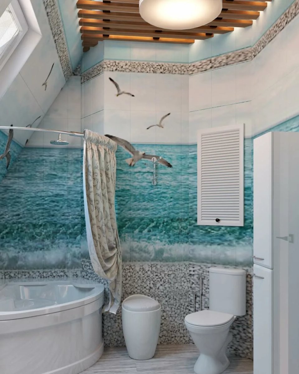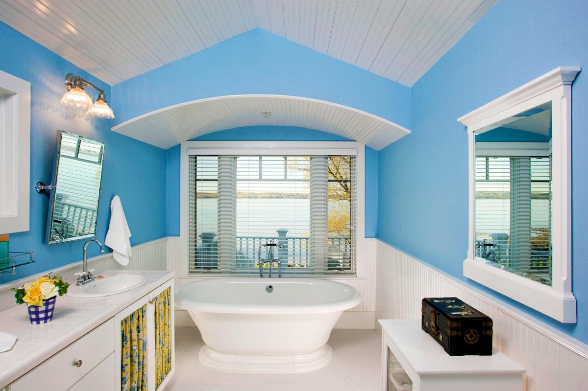 Дизайн ванной комнаты в морском стиле с угловой ванной