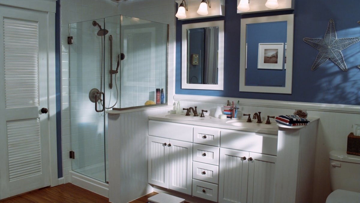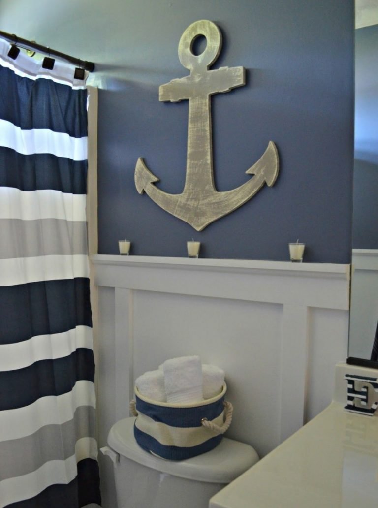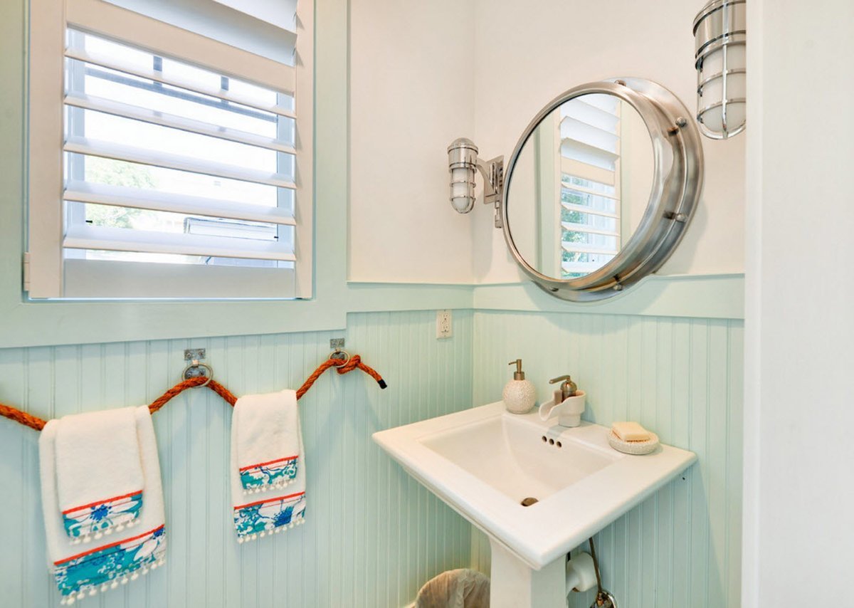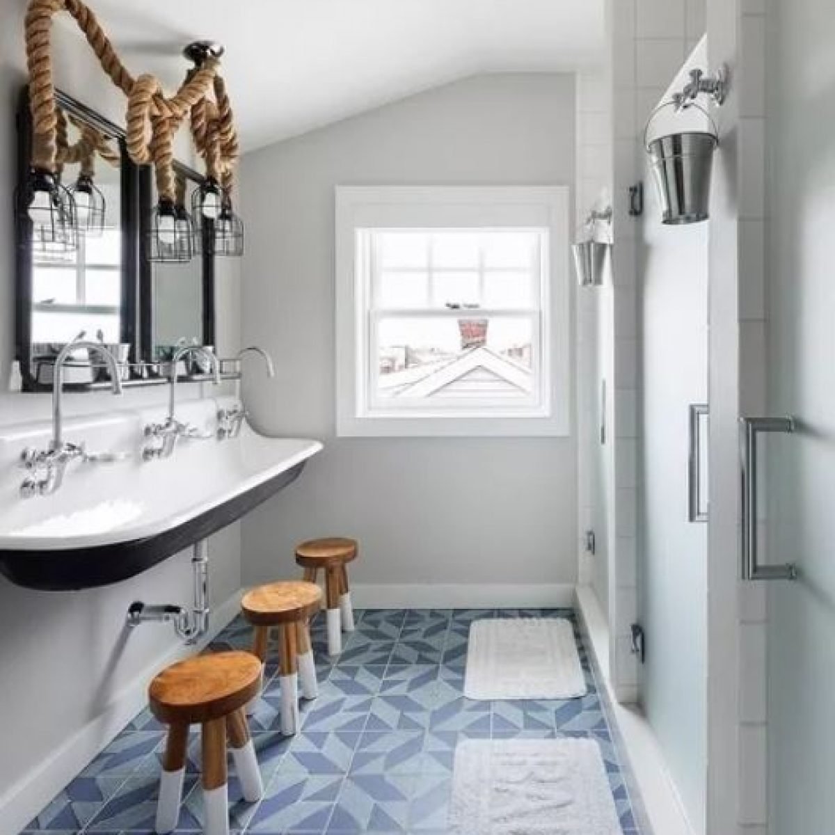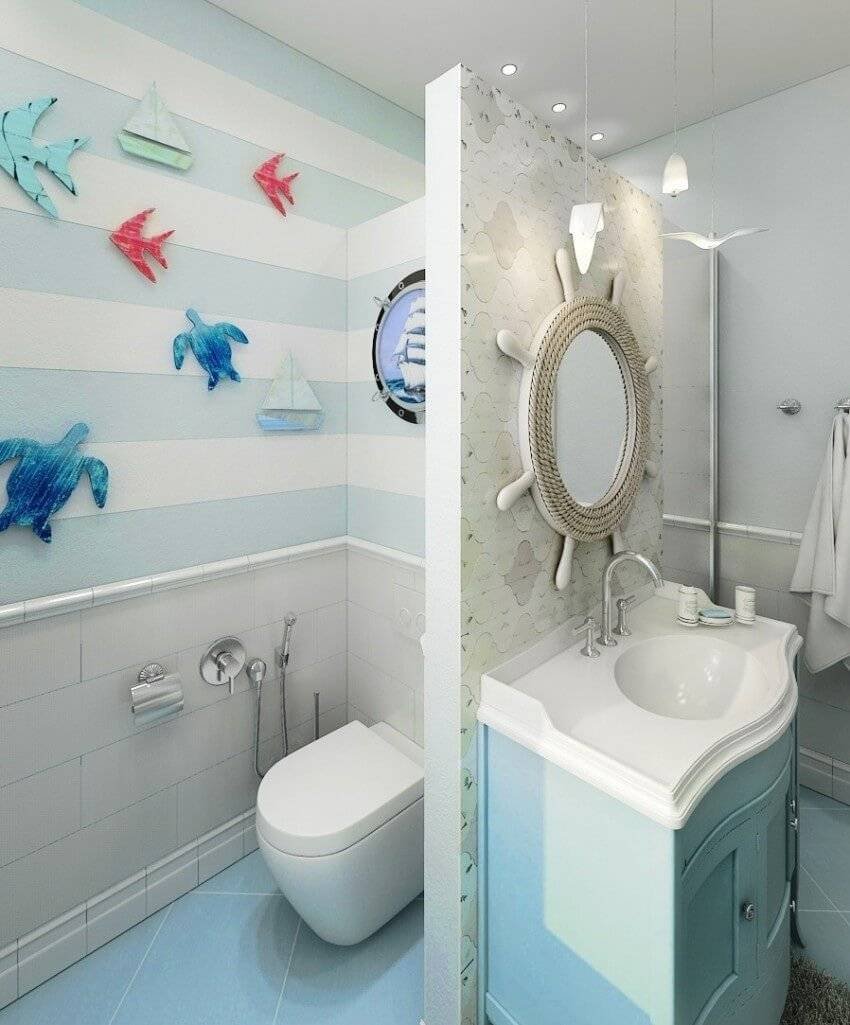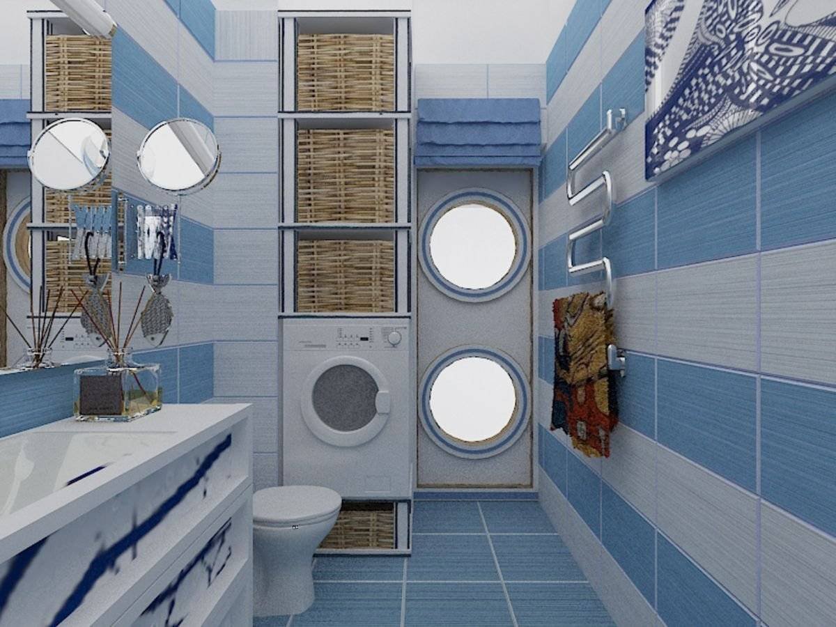 Дизайн ванной комнаты в морском стиле с угловой ванной