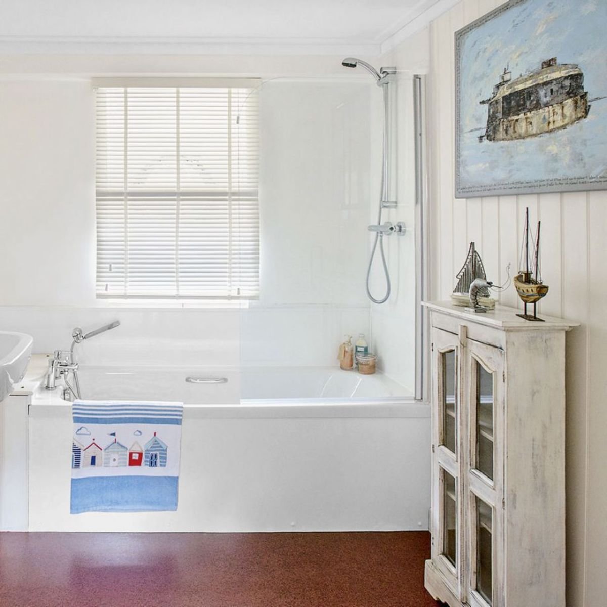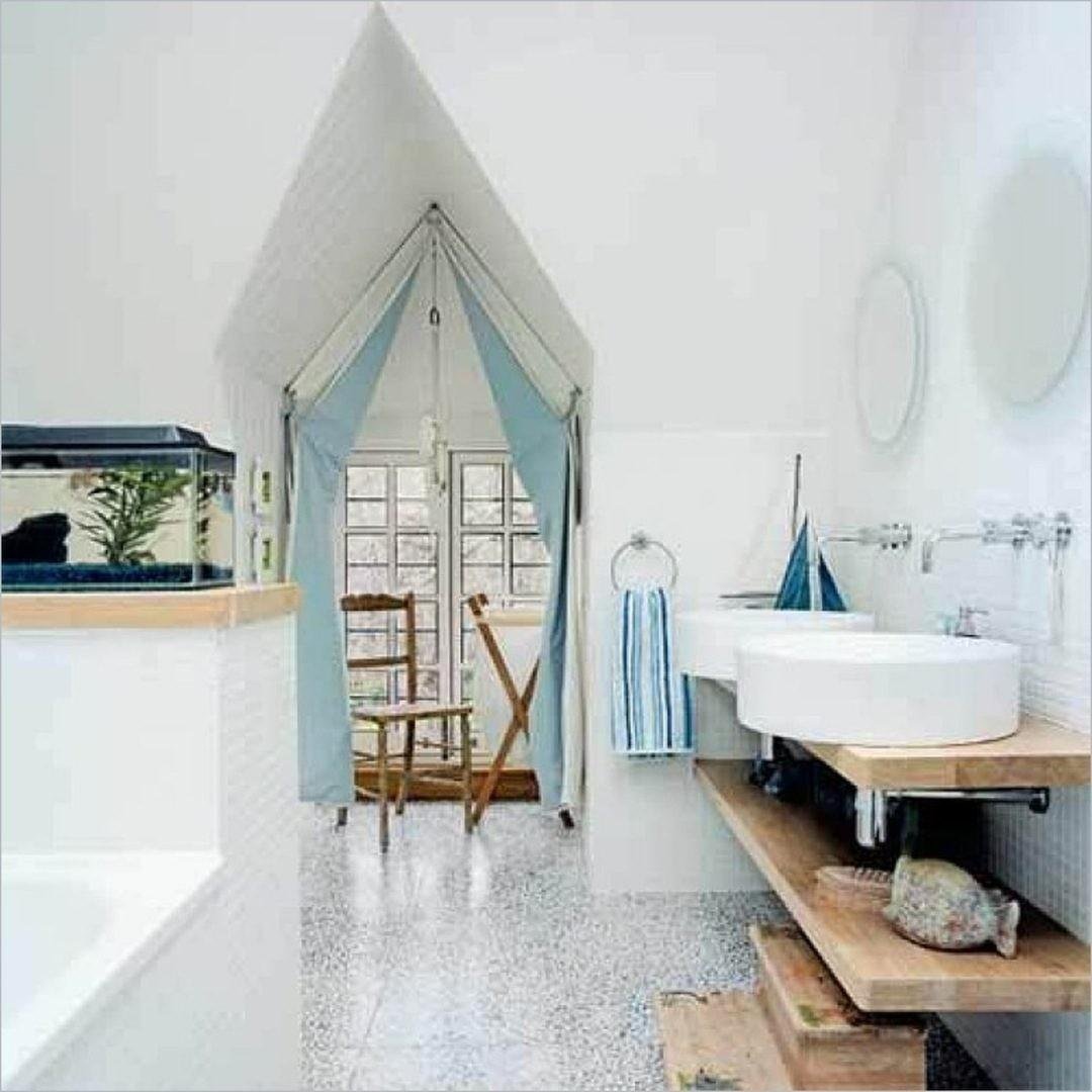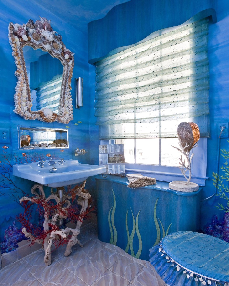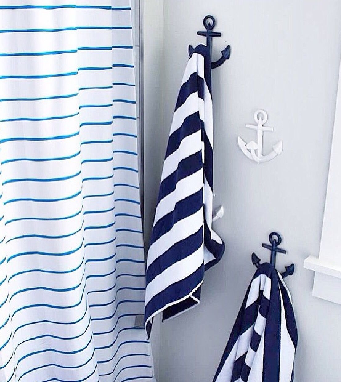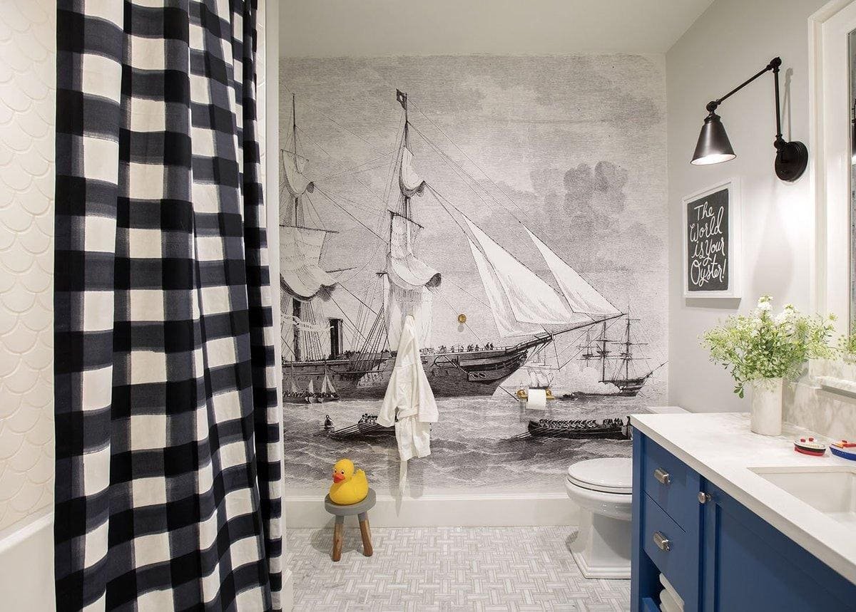 Дизайн ванной комнаты в морском стиле с угловой ванной
