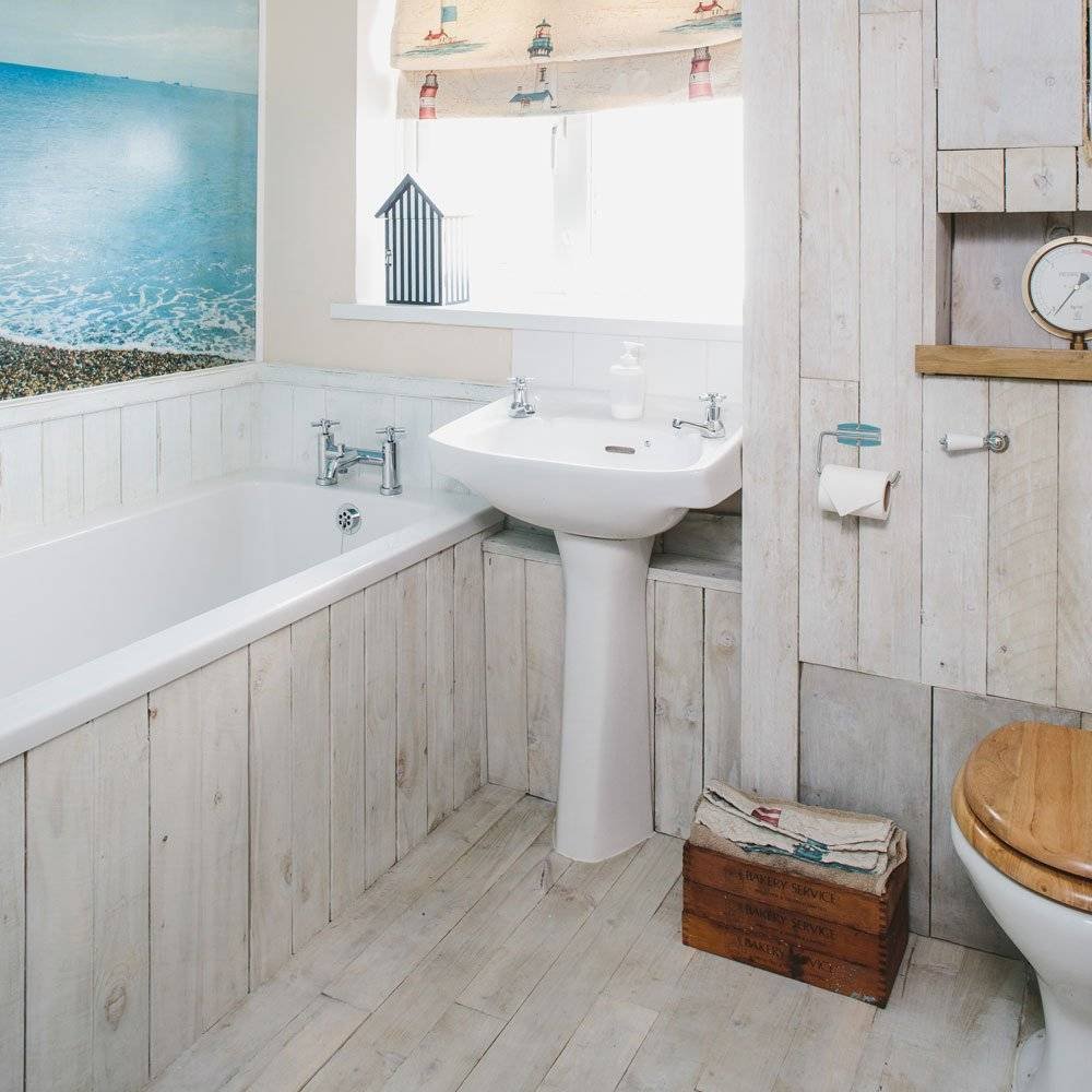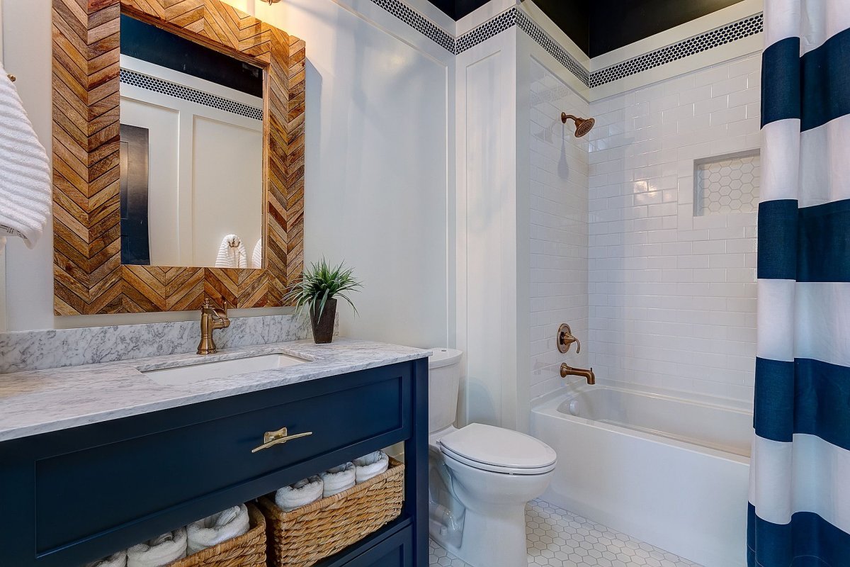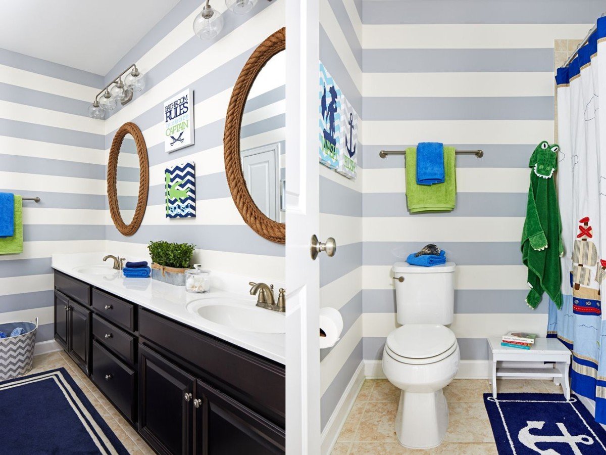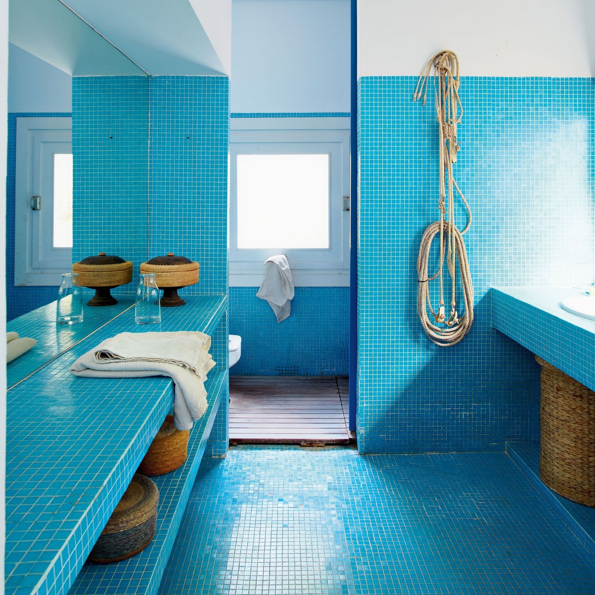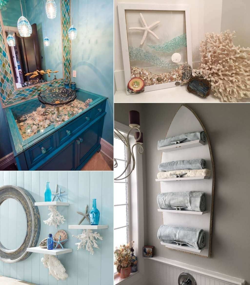 Дизайн ванной комнаты в морском стиле с угловой ванной