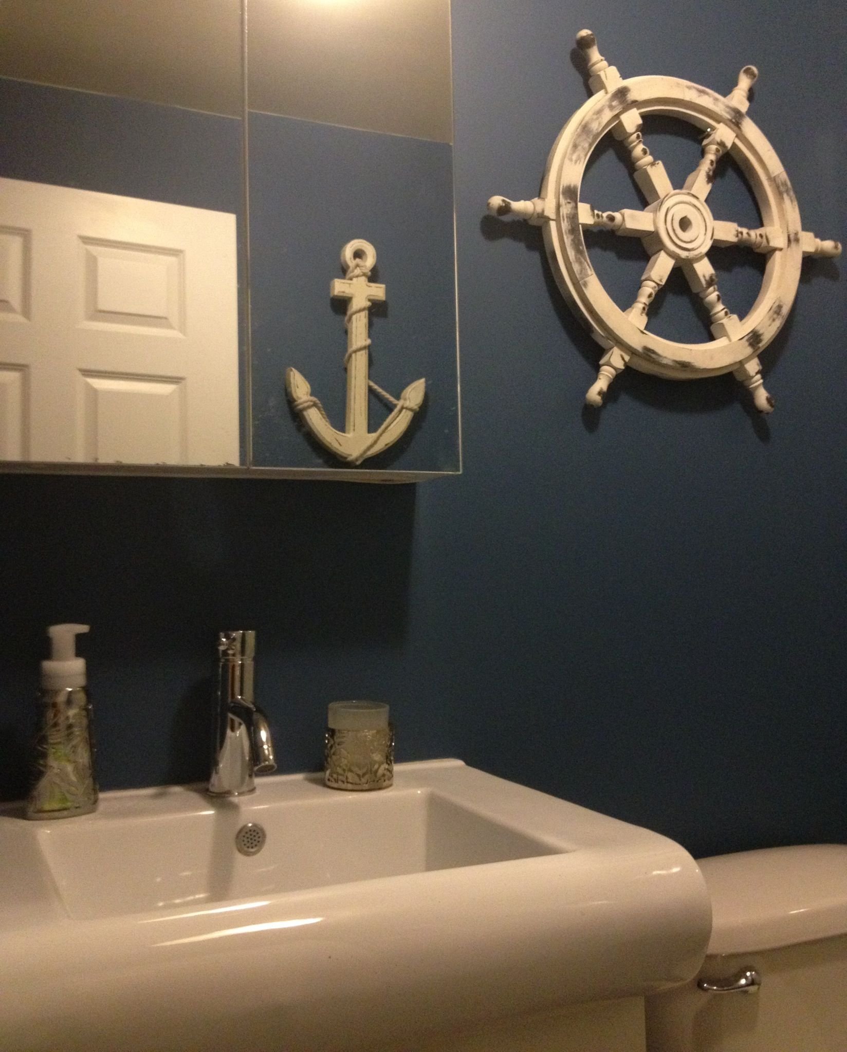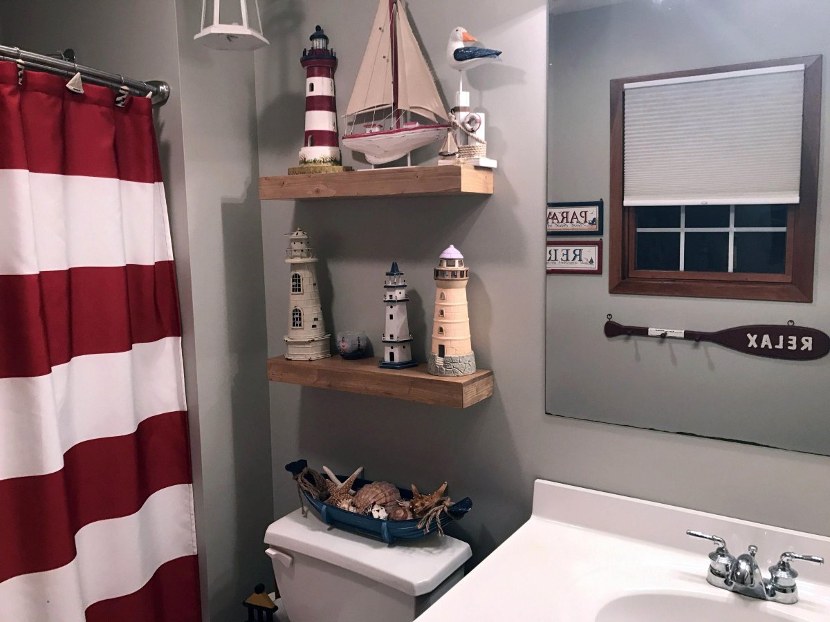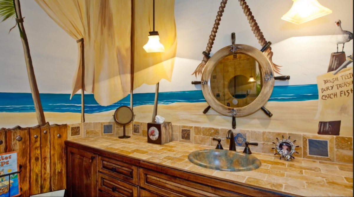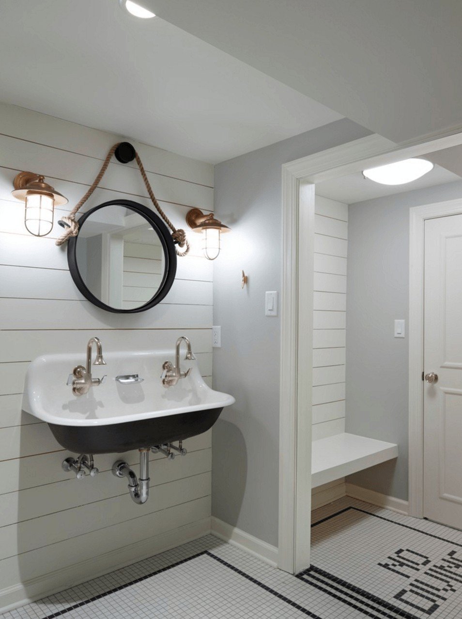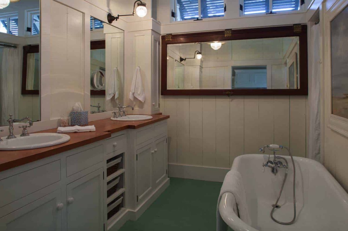 Дизайн ванной комнаты в морском стиле с угловой ванной