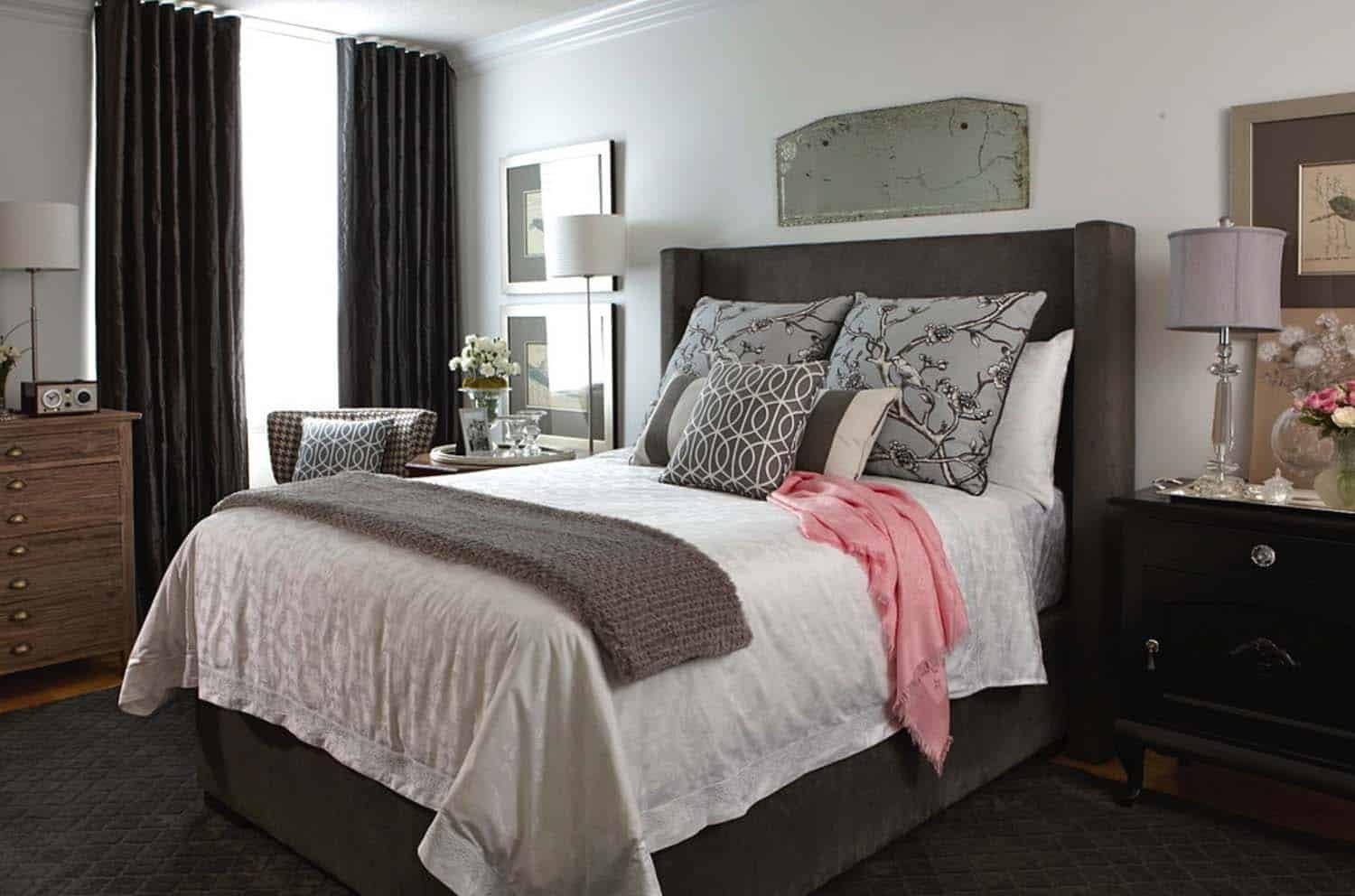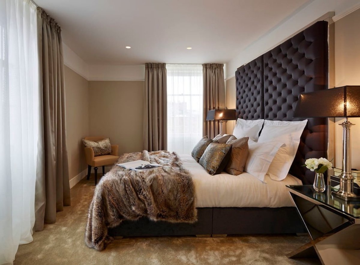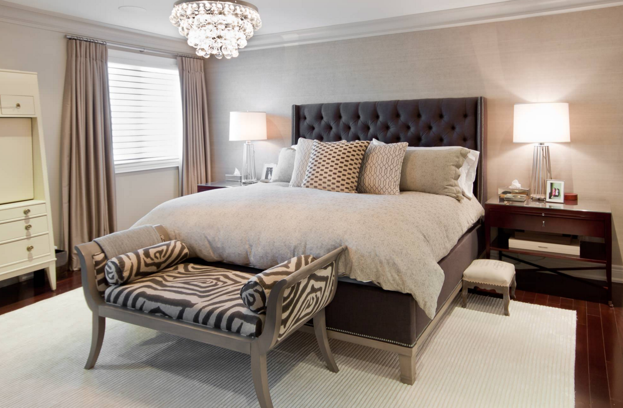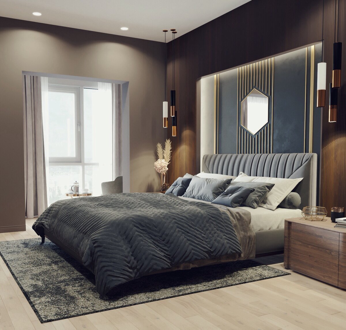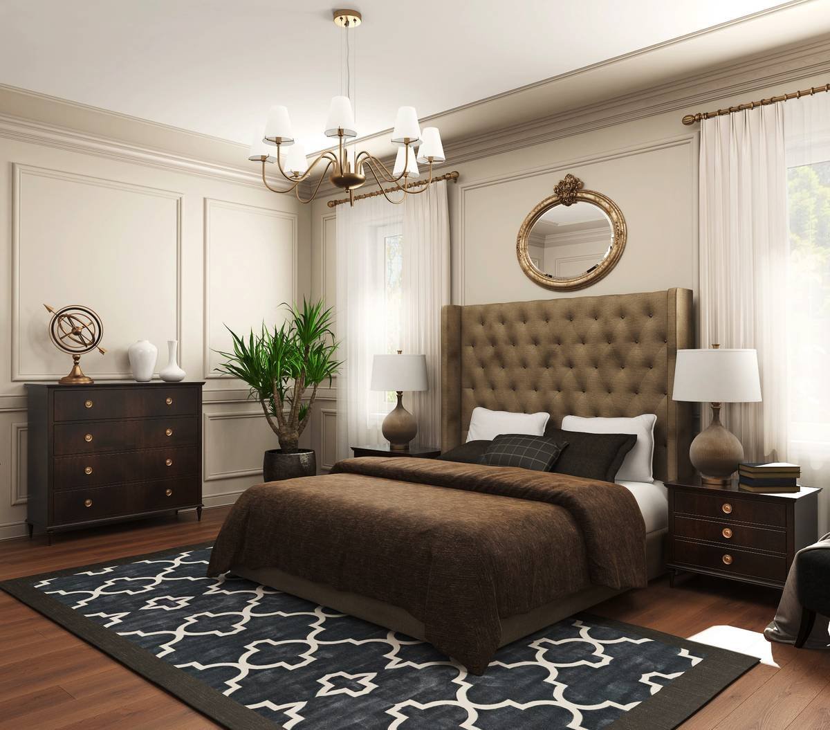 Интерьер спальни в неоклассическом стиле с темной мебелью