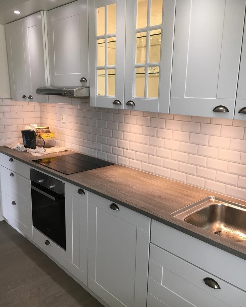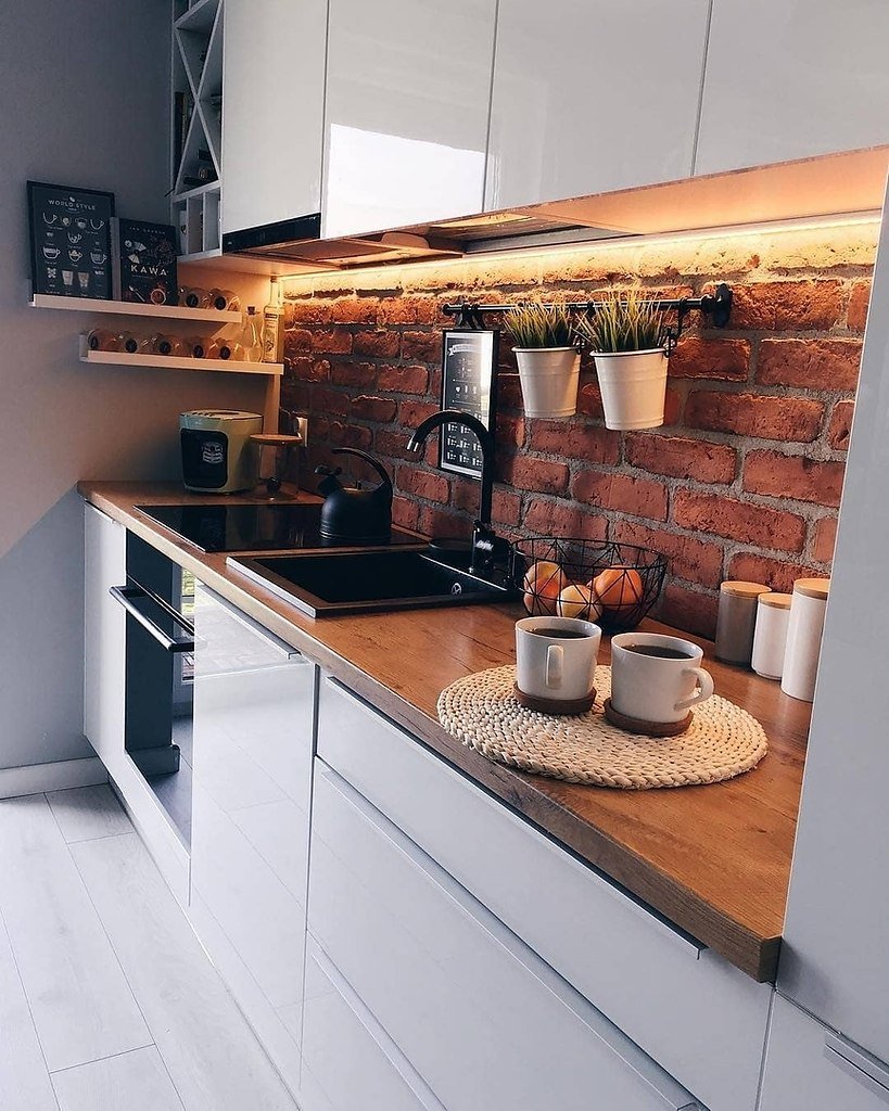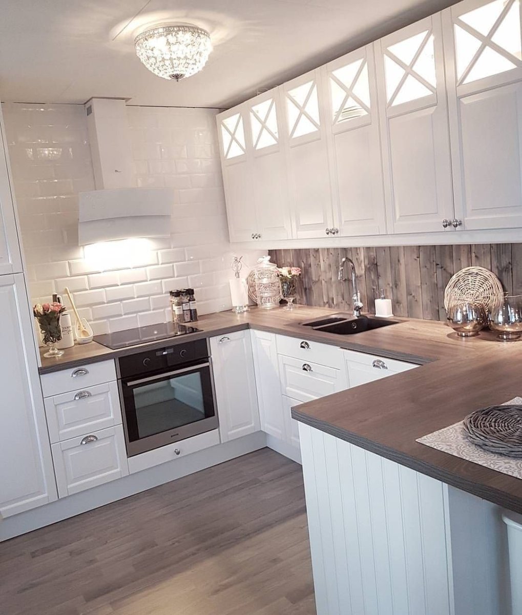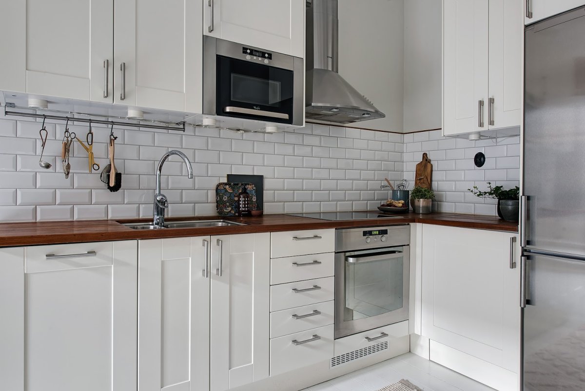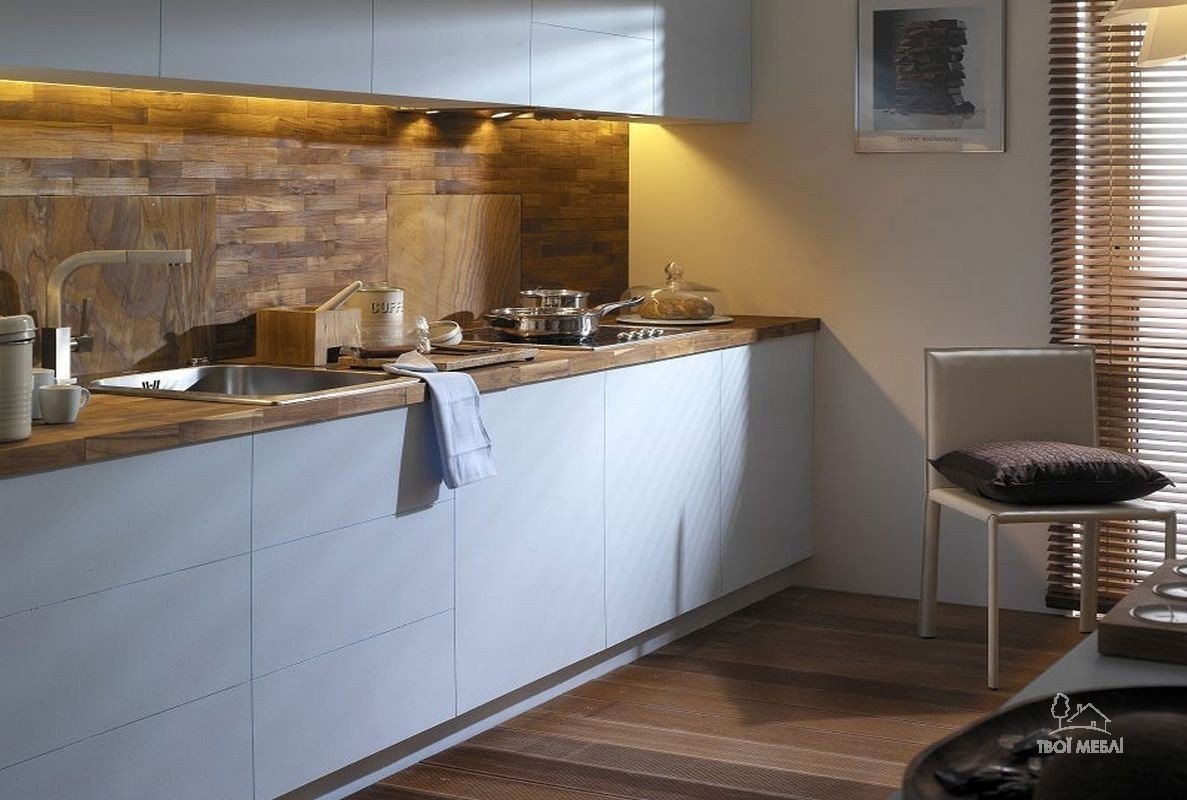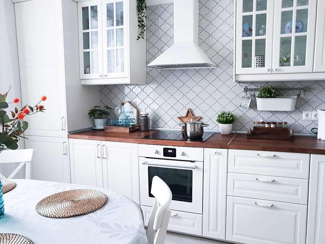 Белая кухня с деревянной столешницей и мраморным фартуком
