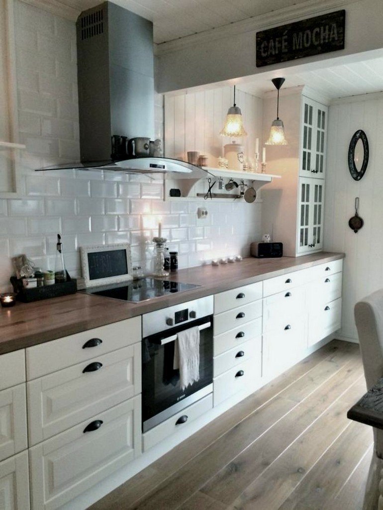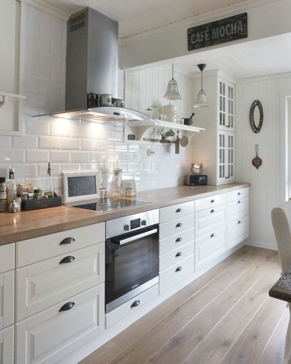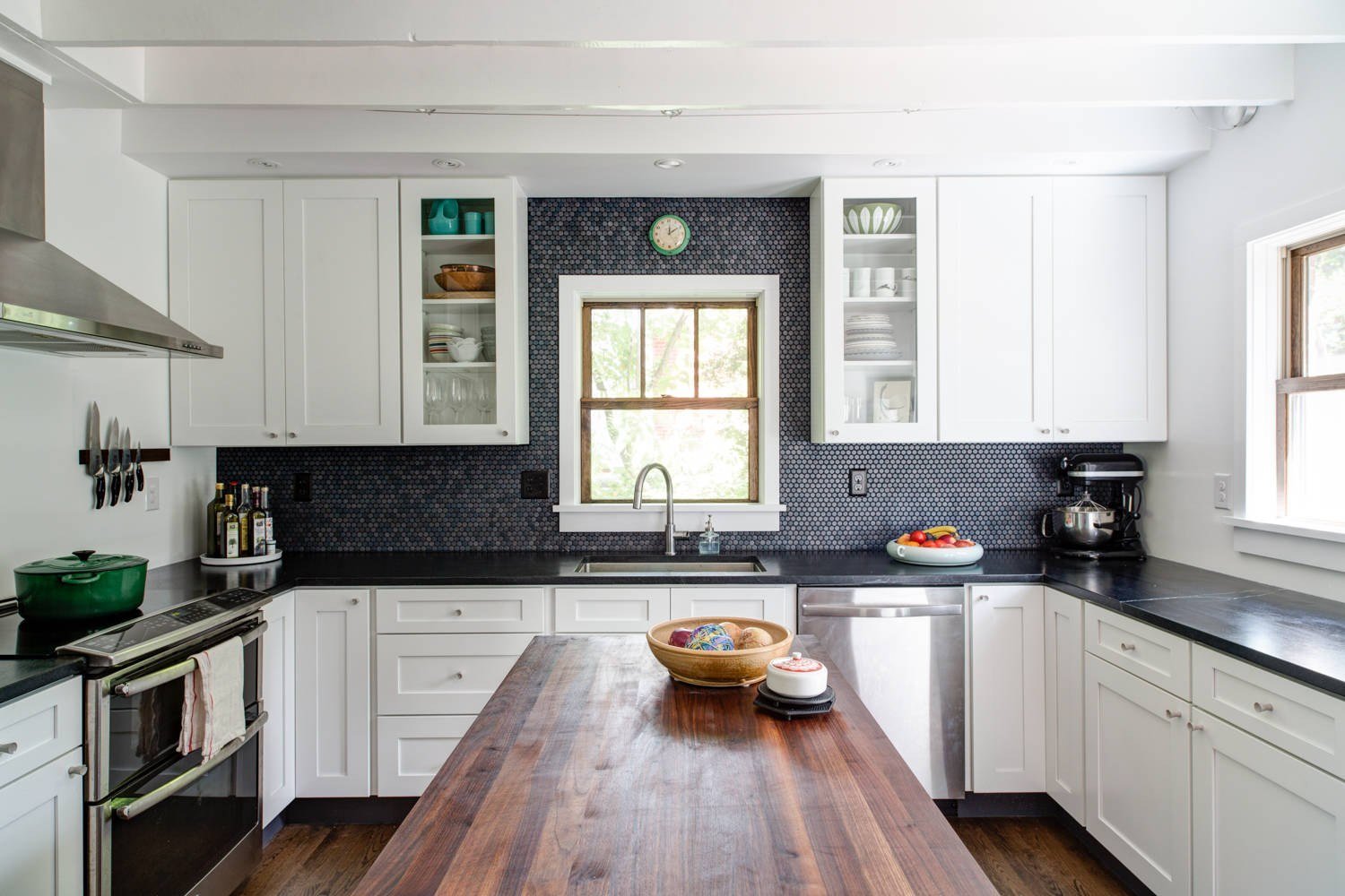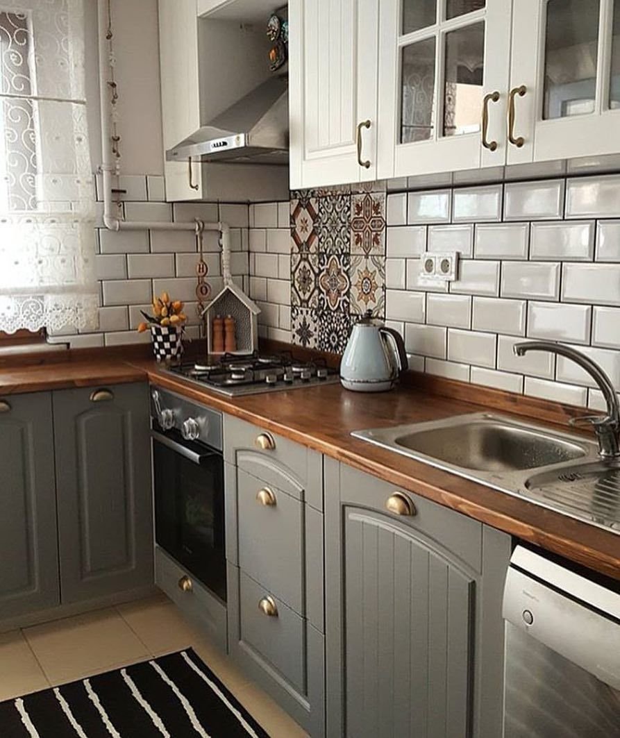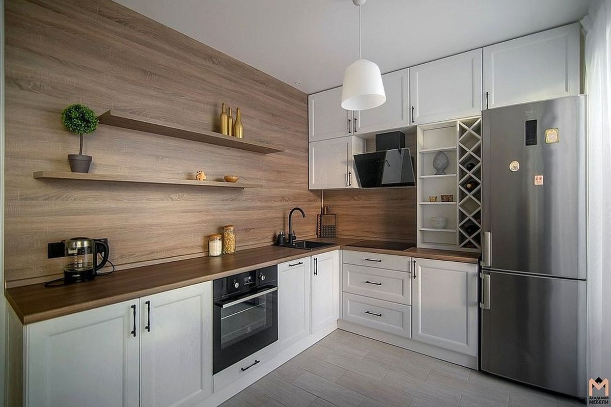 Белая кухня с деревянной столешницей и мраморным фартуком
