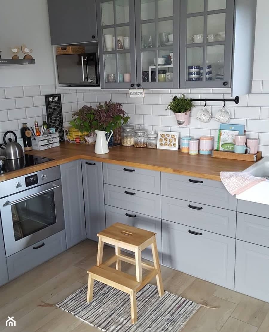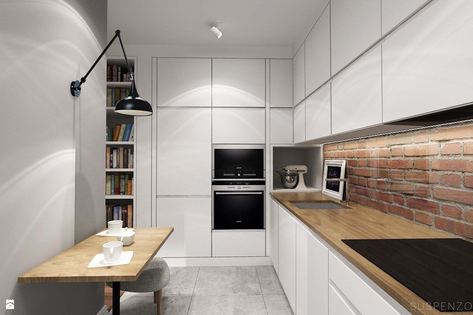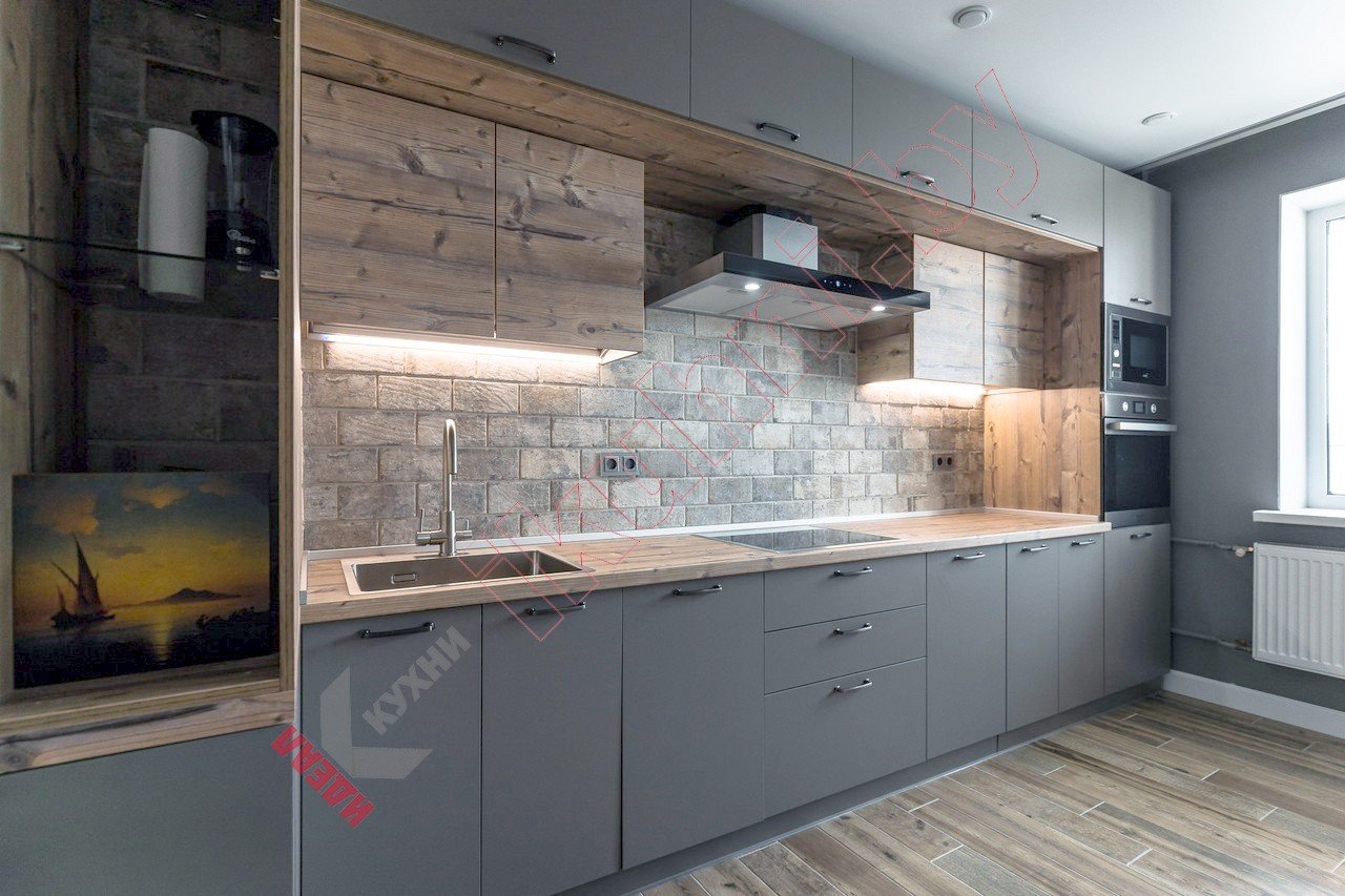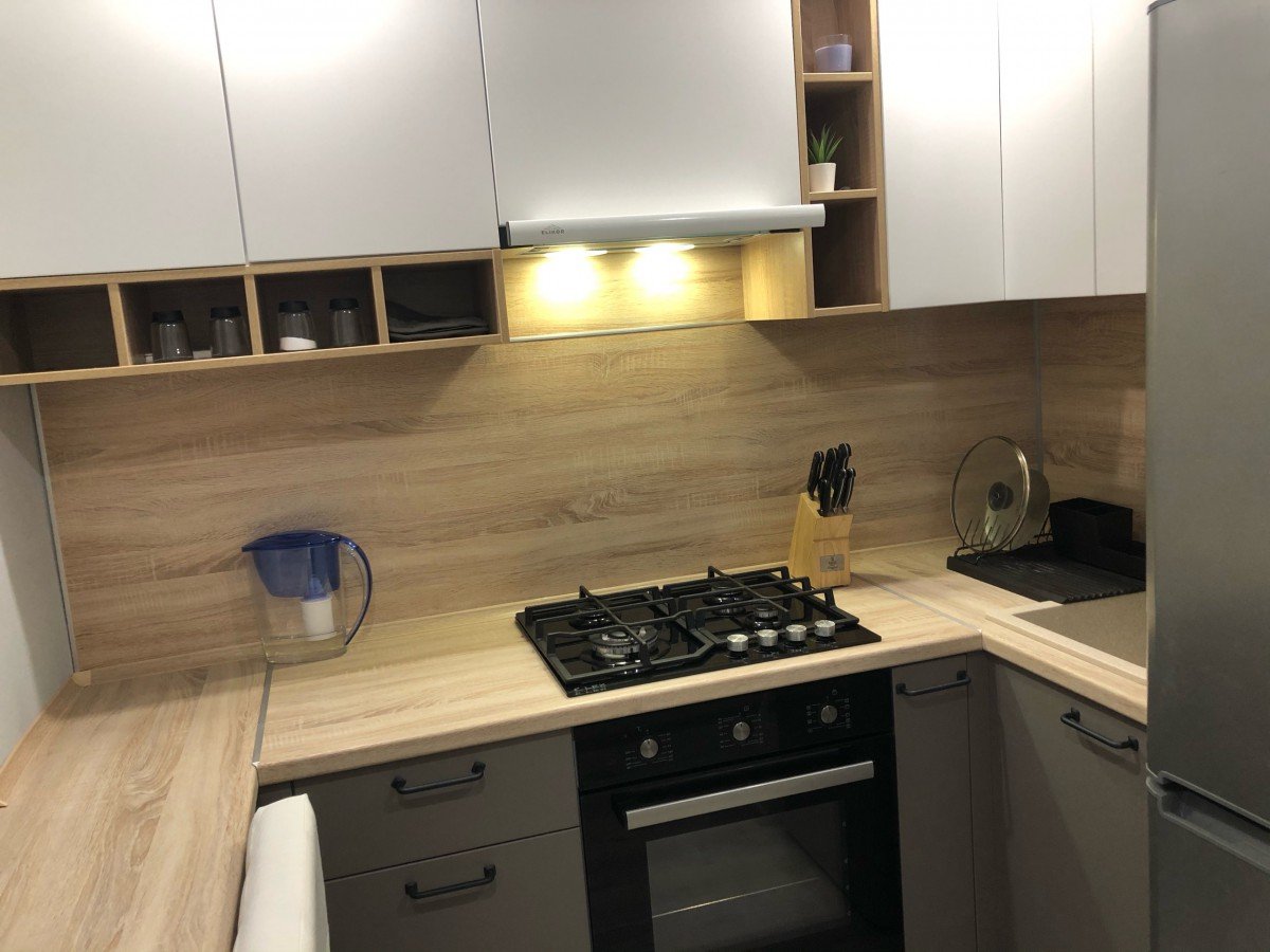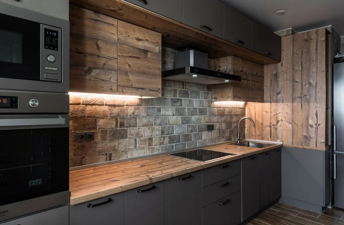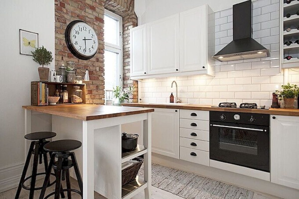 Белая кухня с деревянной столешницей и мраморным фартуком