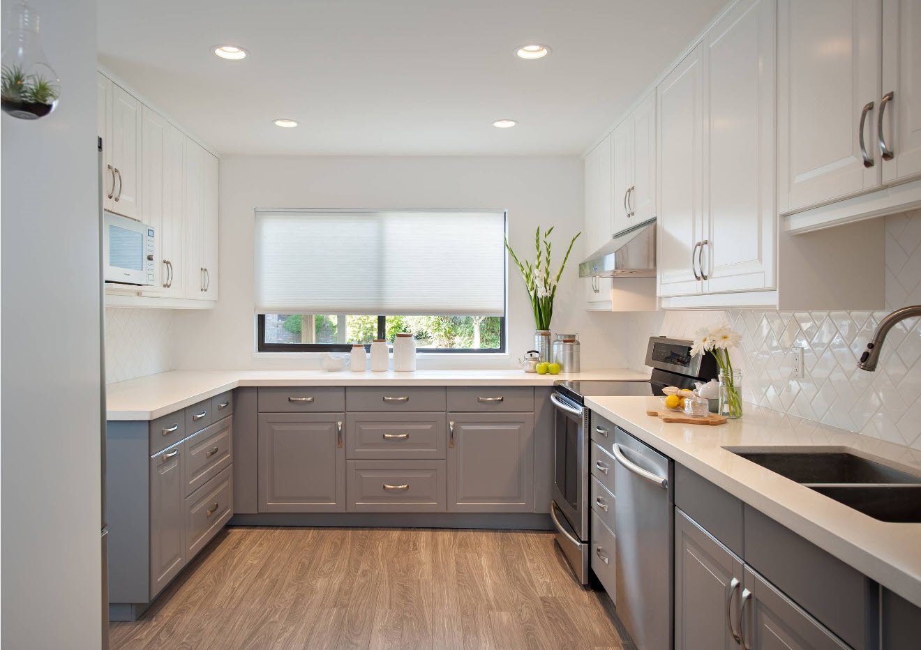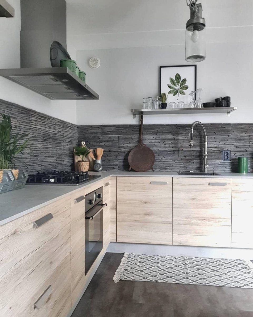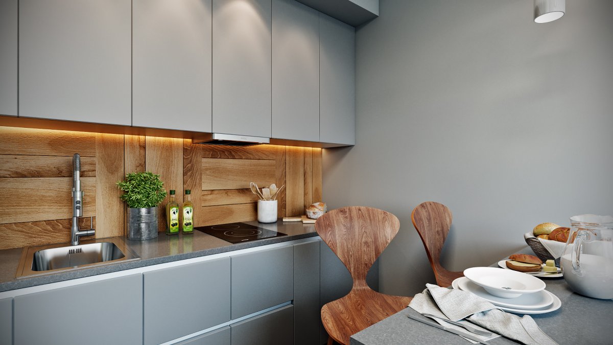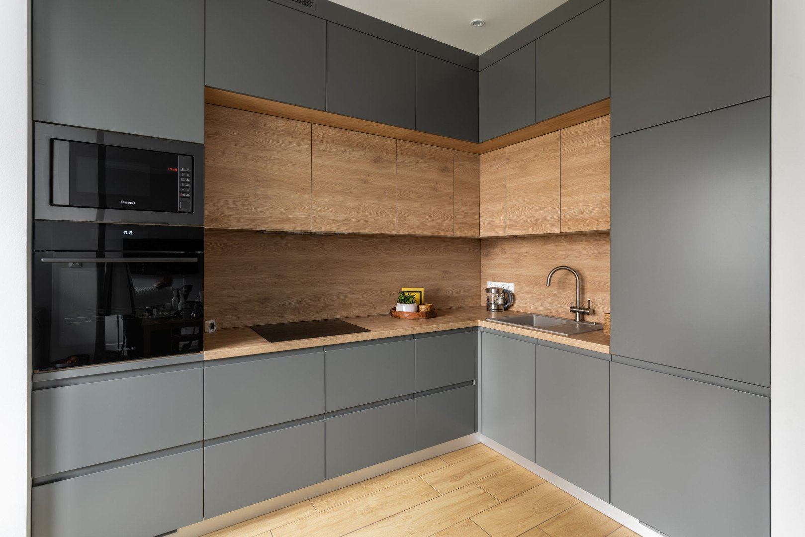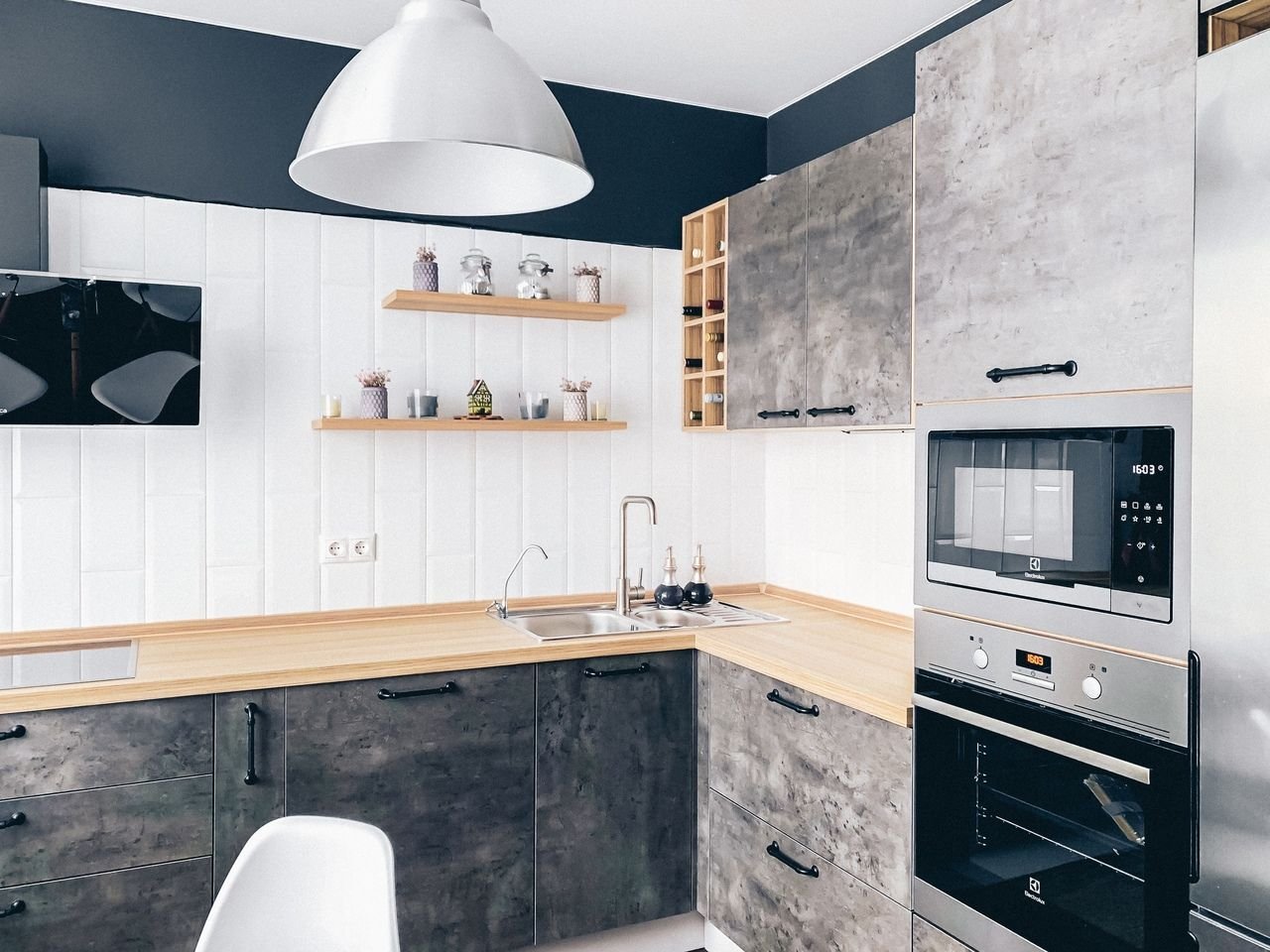 Белая кухня с деревянной столешницей и мраморным фартуком