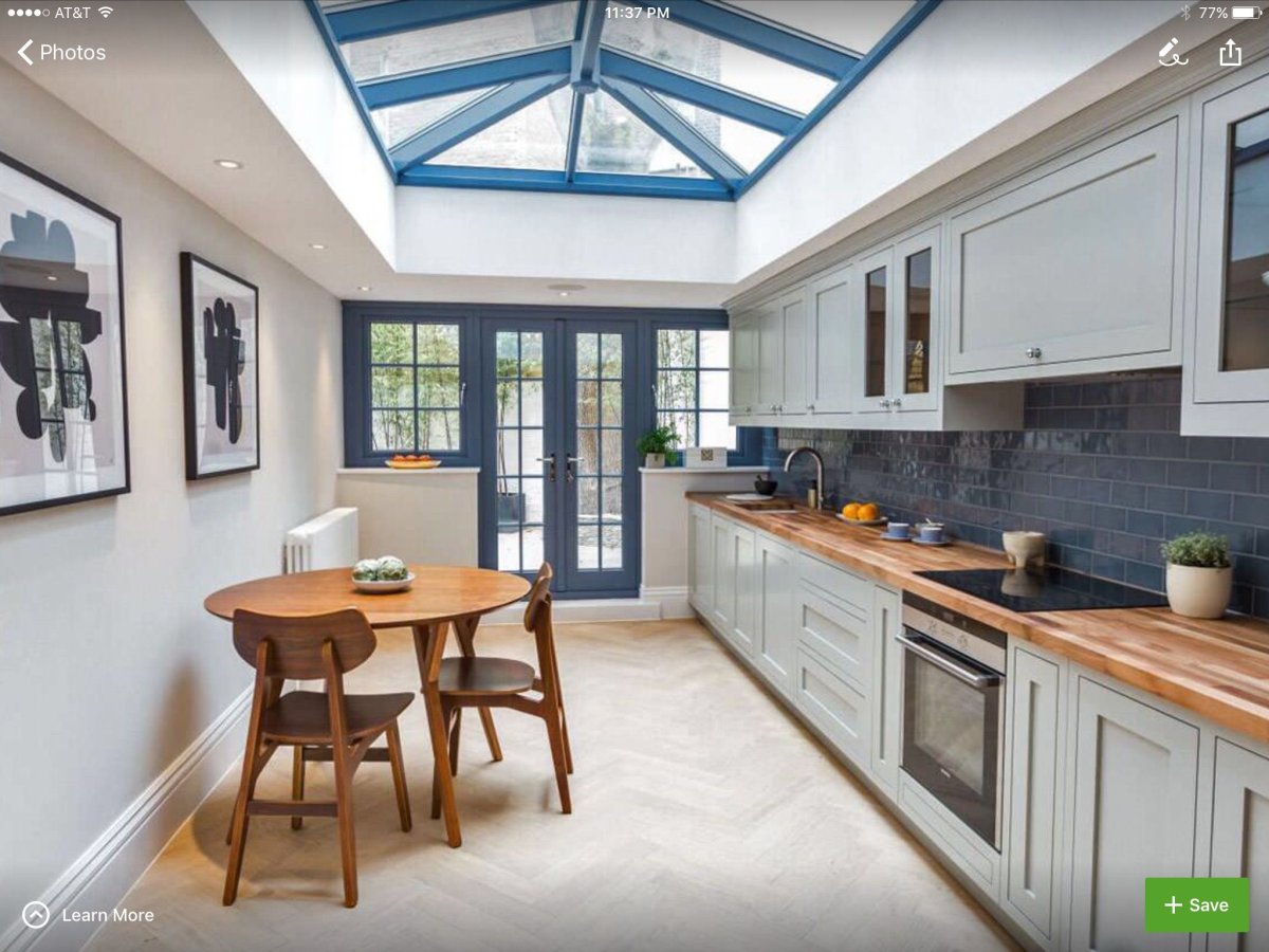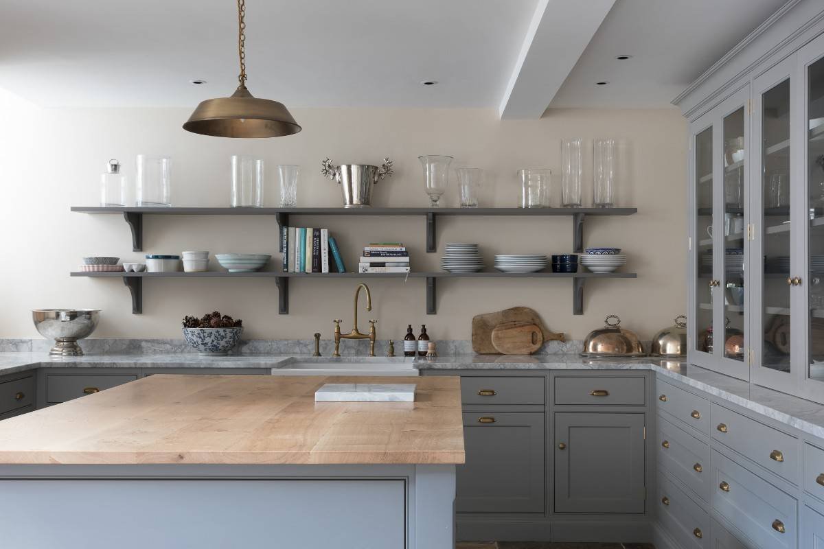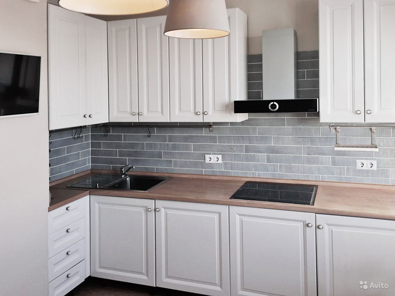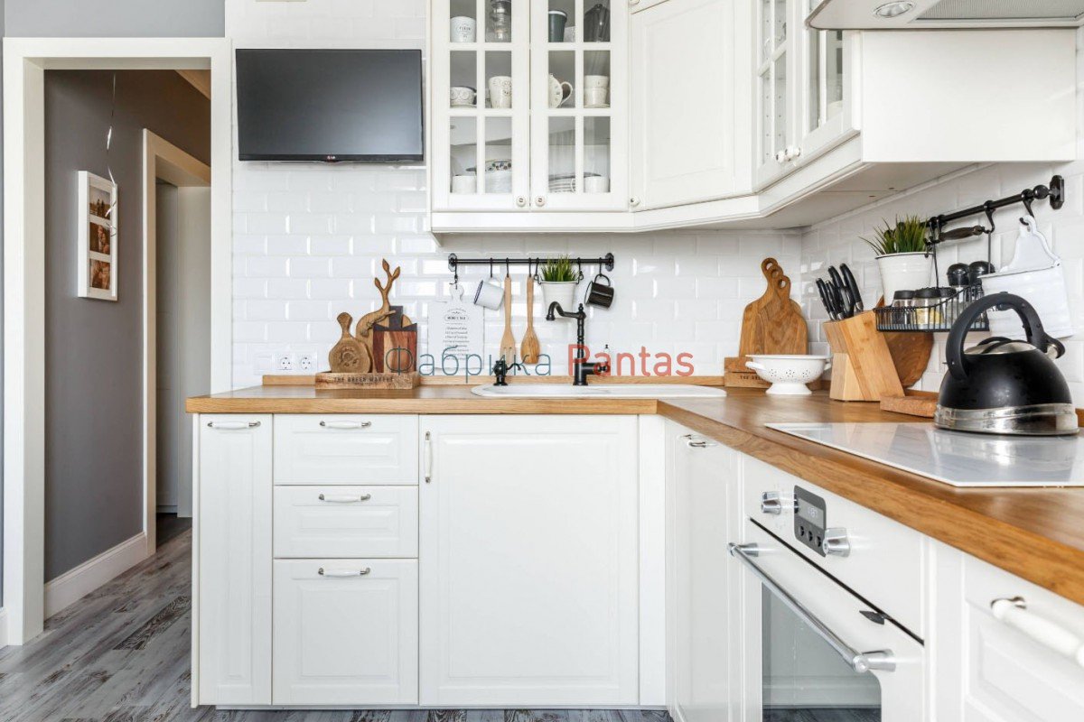 Белая кухня Неоклассика с деревянной столешницей и фартуком
