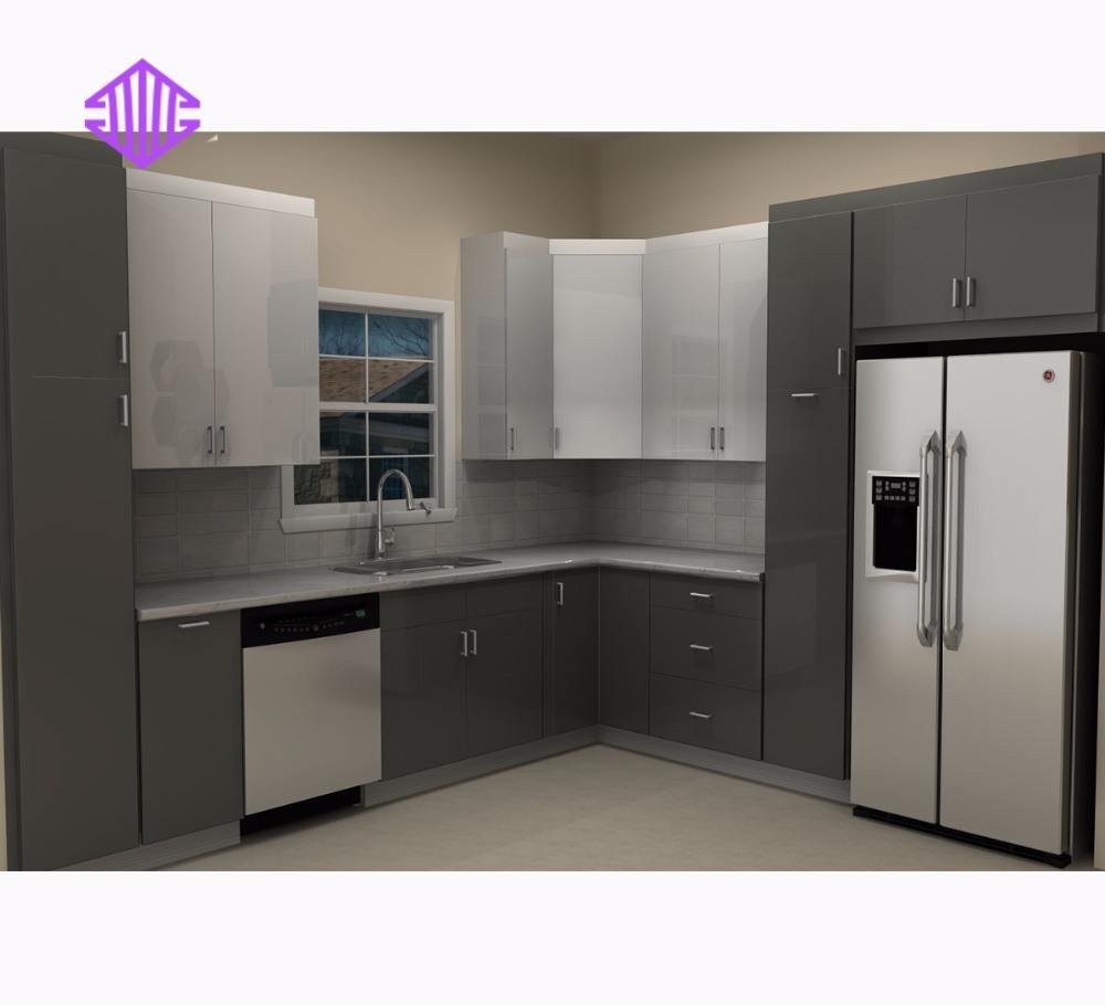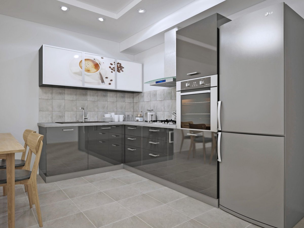 Угловая кухня с серым холодильником