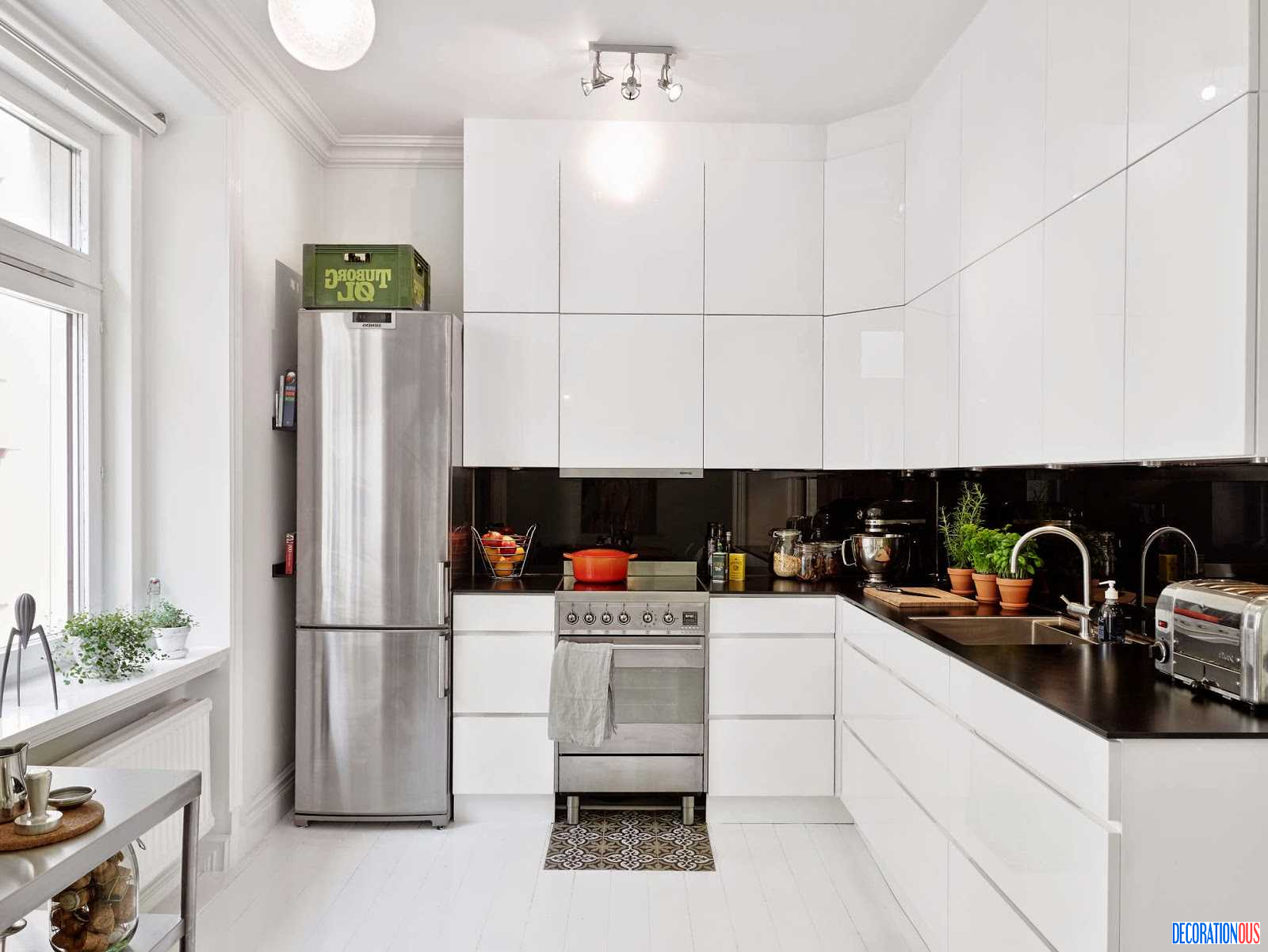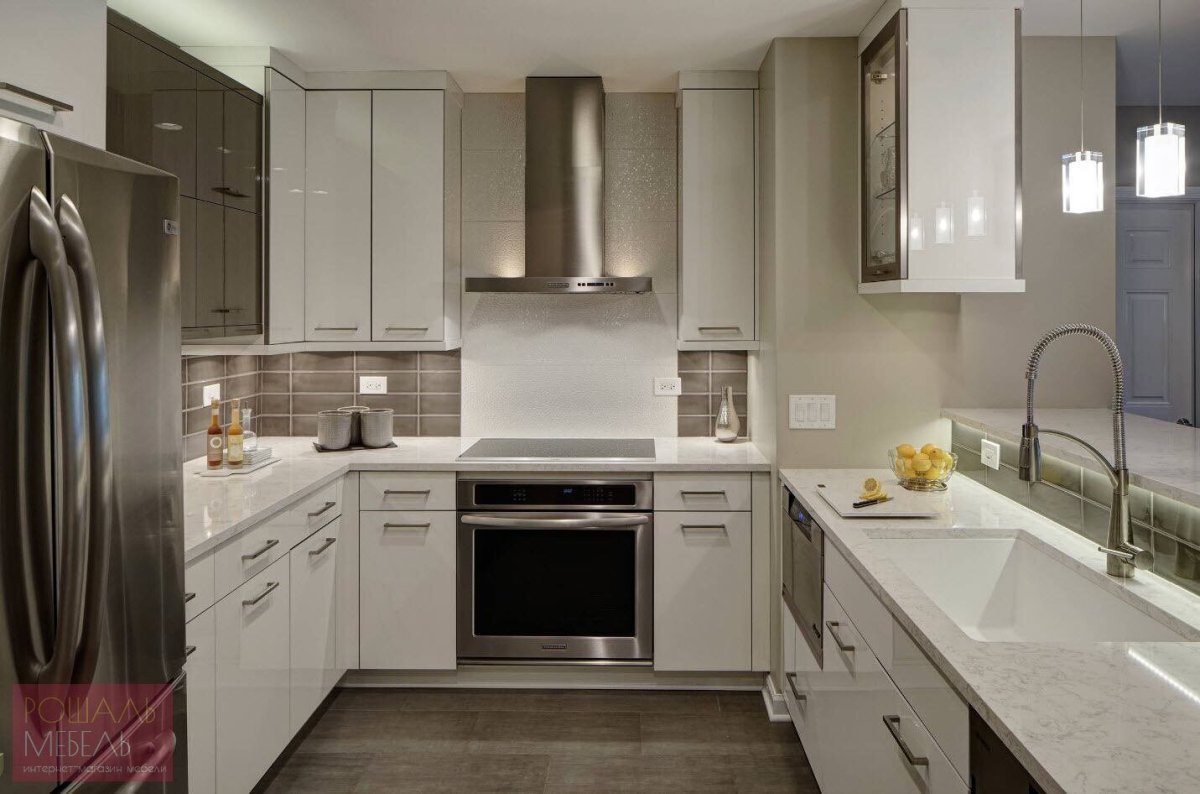 Белая кухня с серебристым холодильником