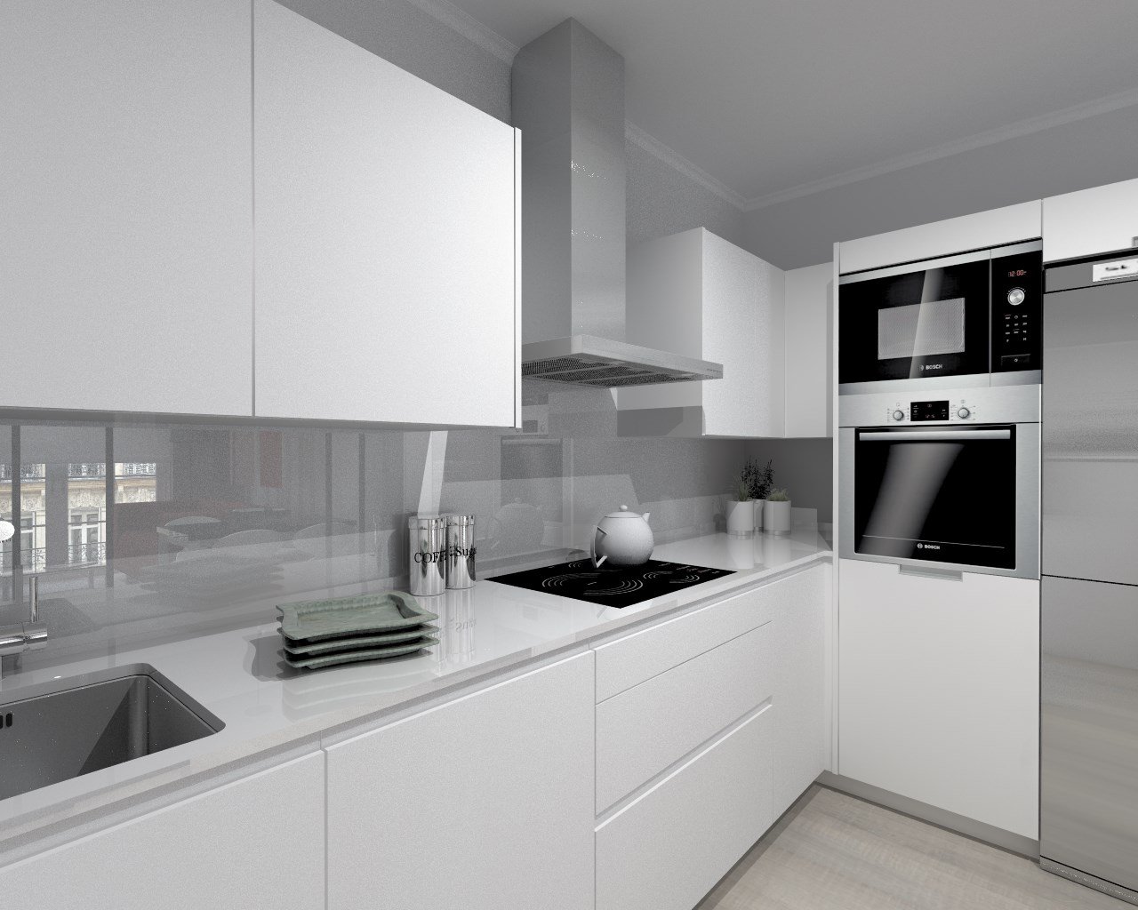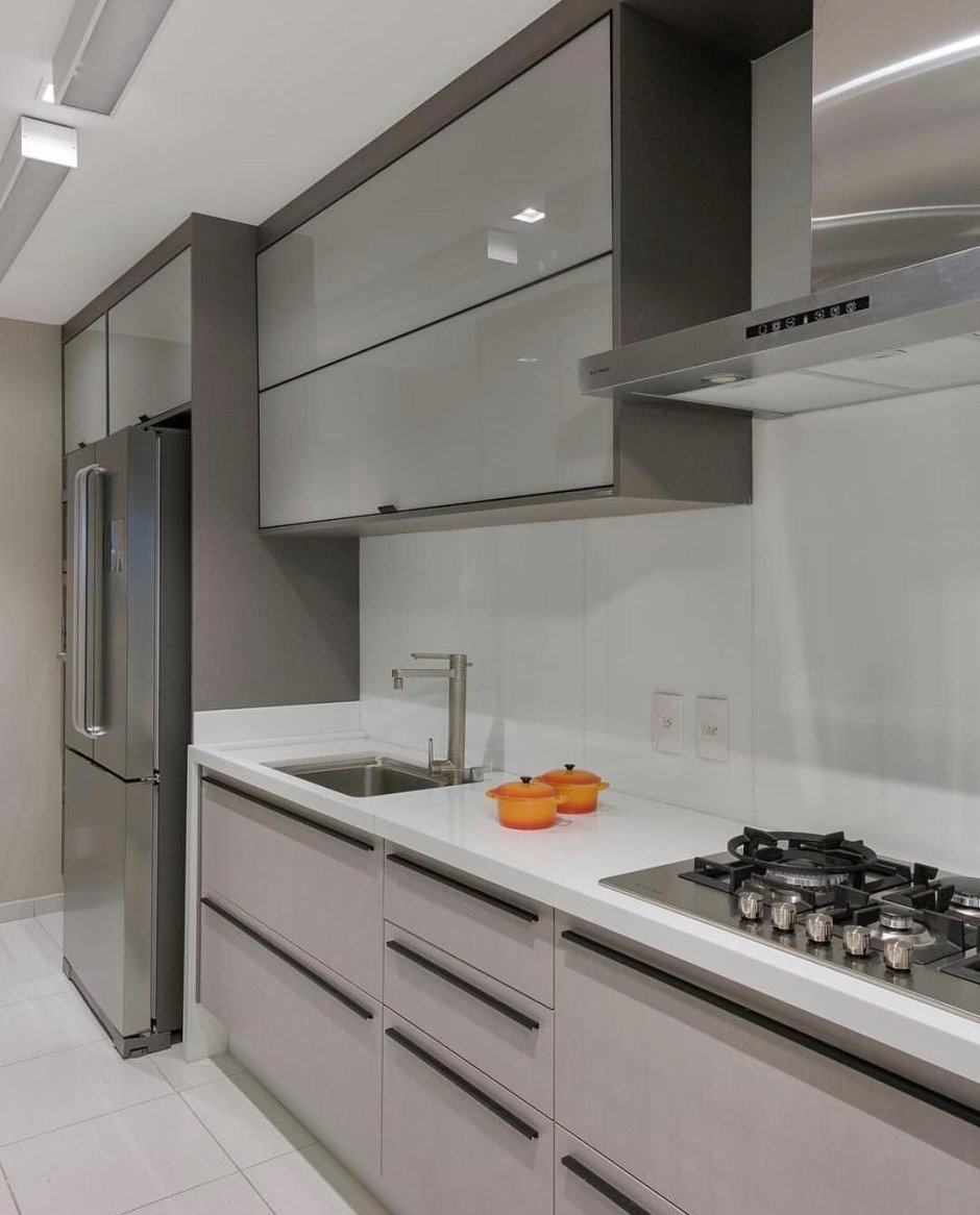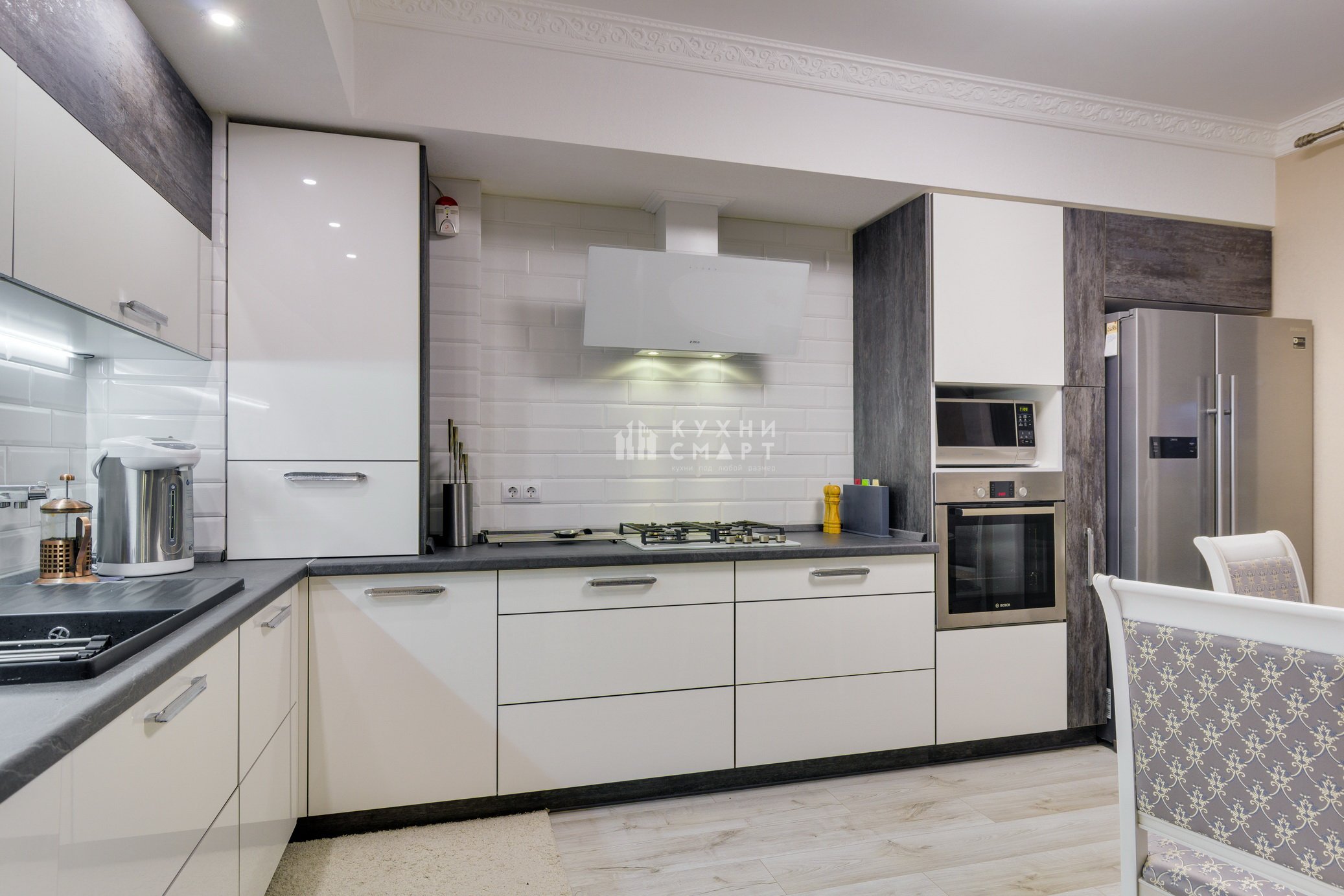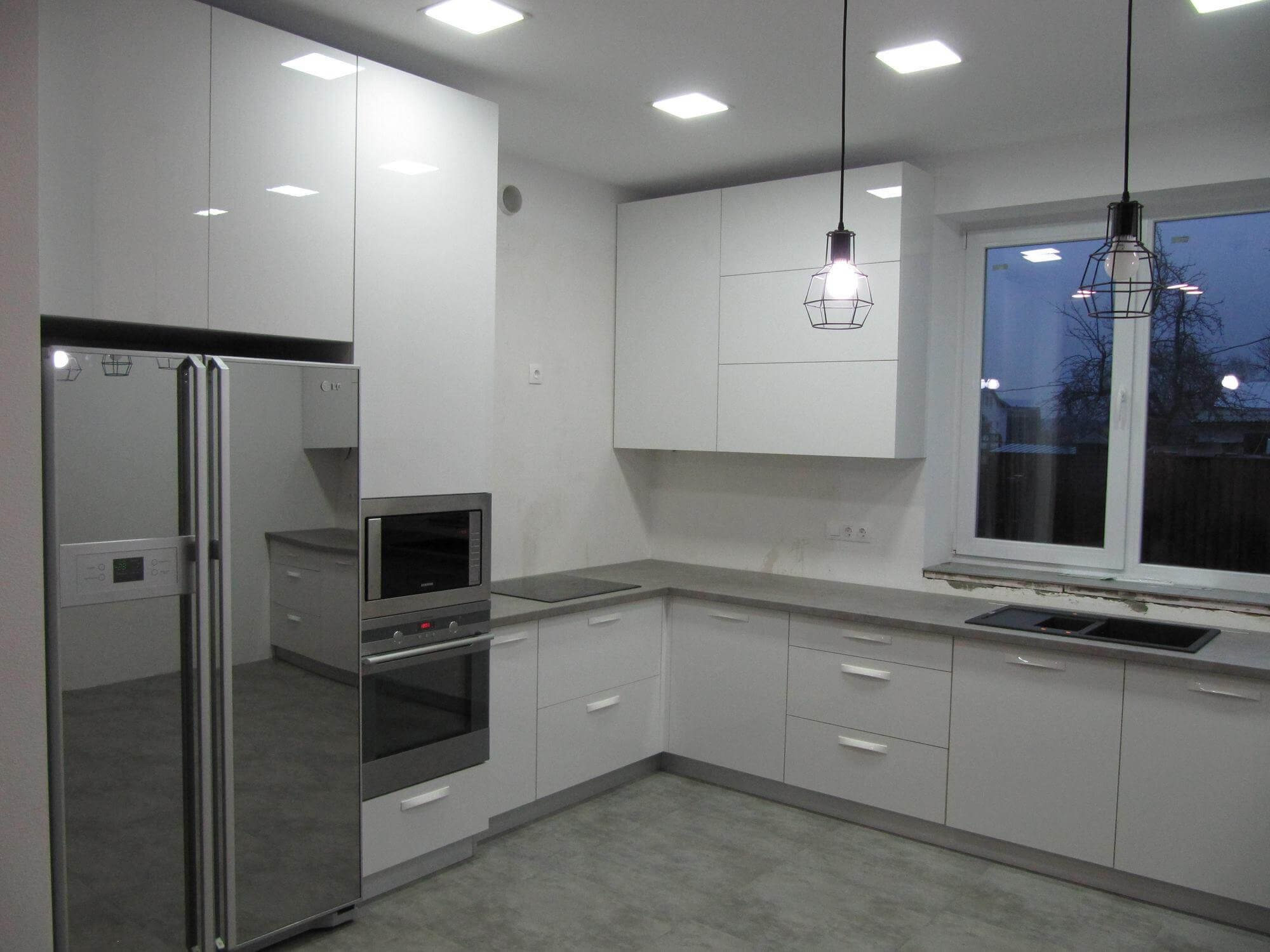 Белая кухня с серым холодильником