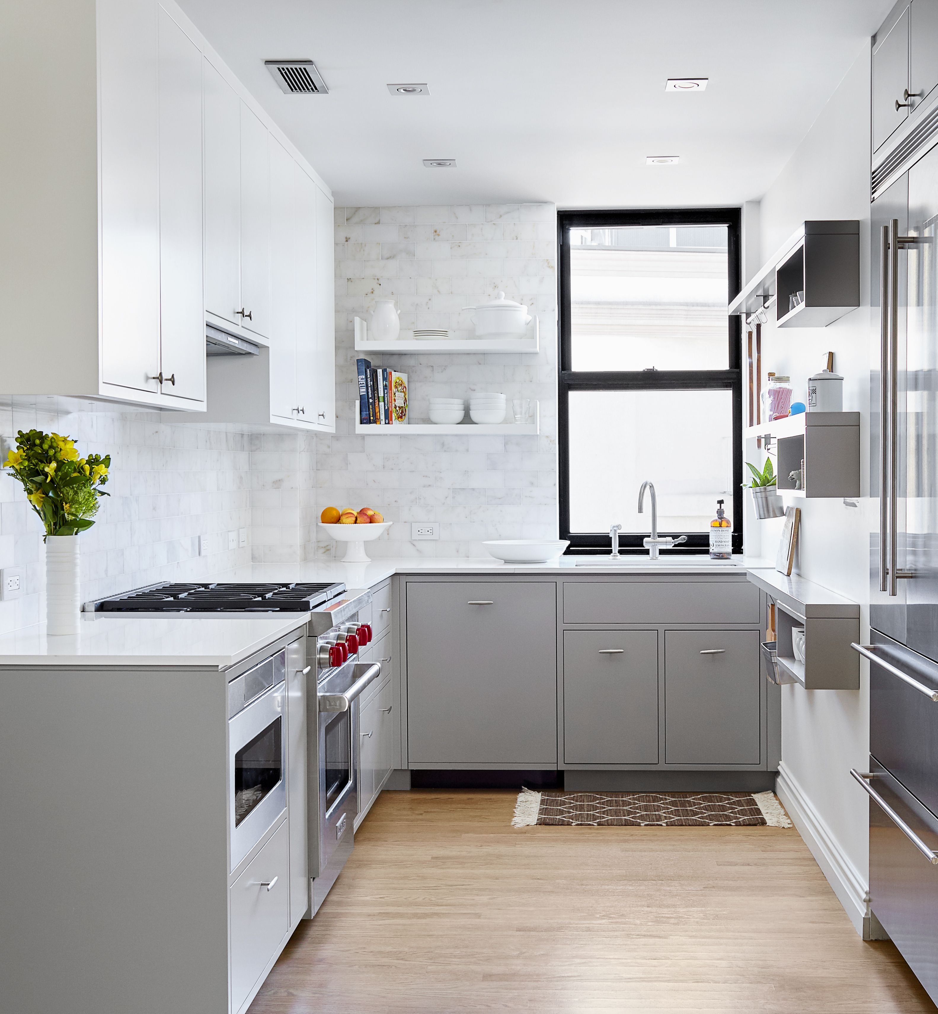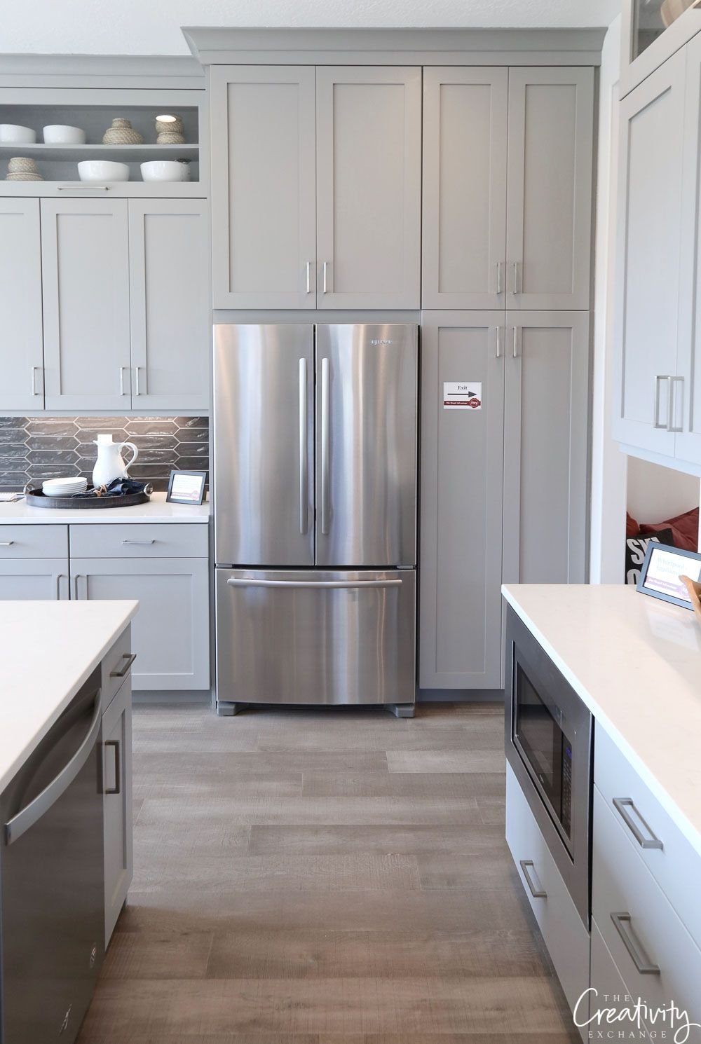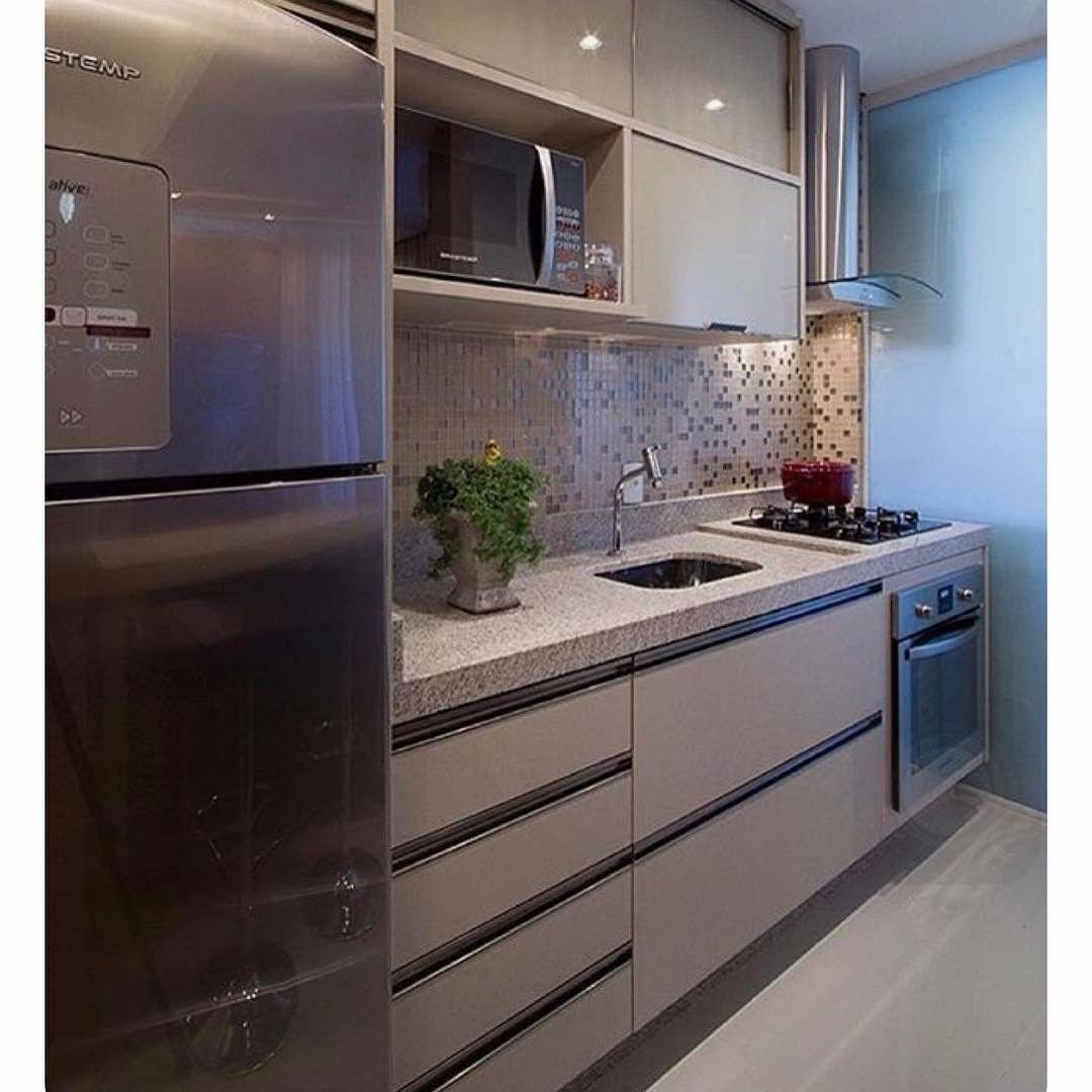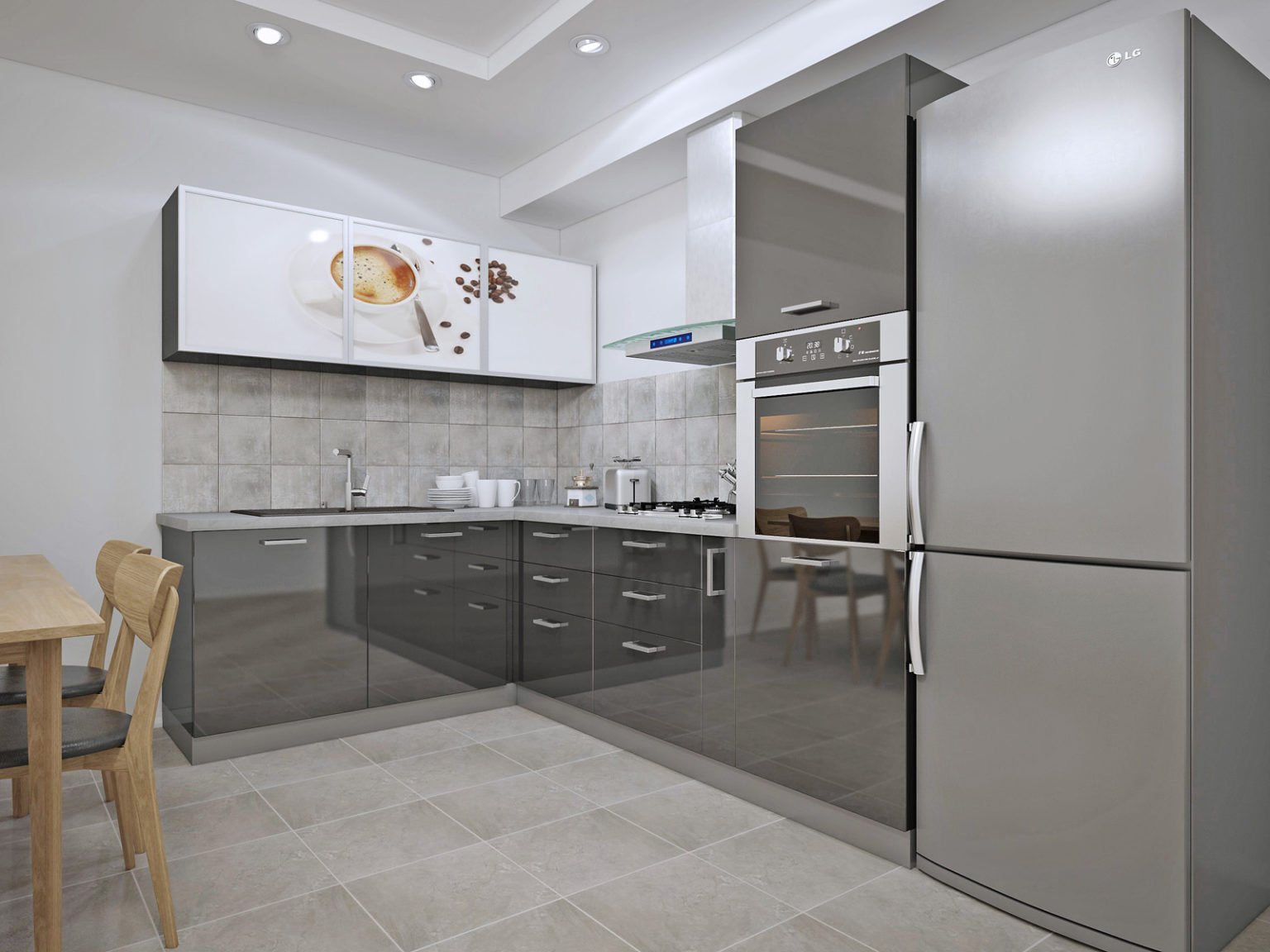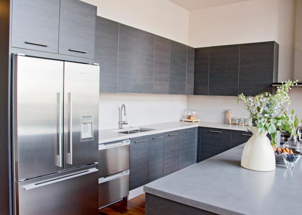 Кухня с серым холодильником