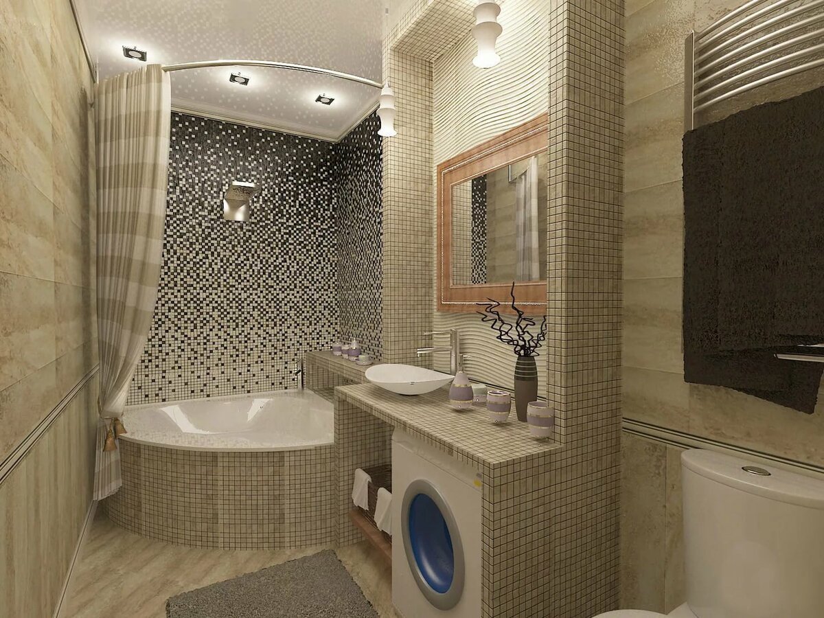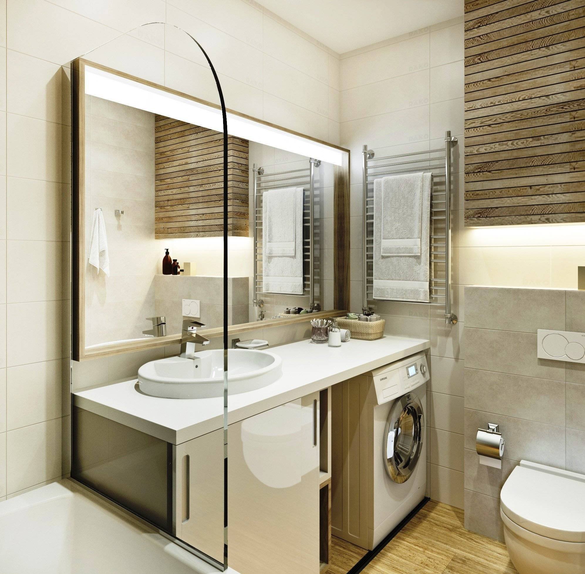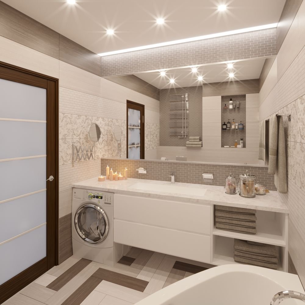 Интерьер совмещенного санузла с ванной и стиральной машиной