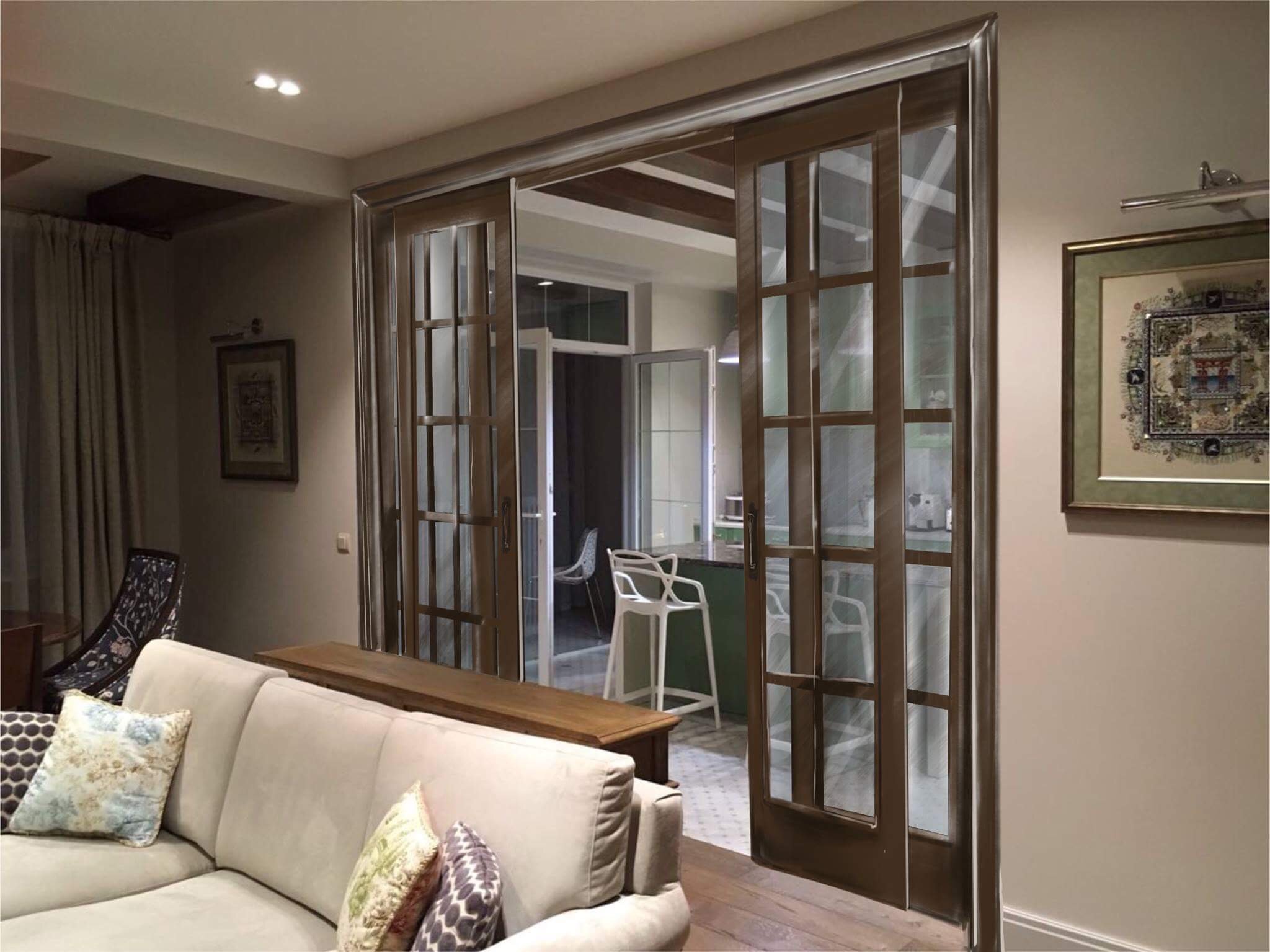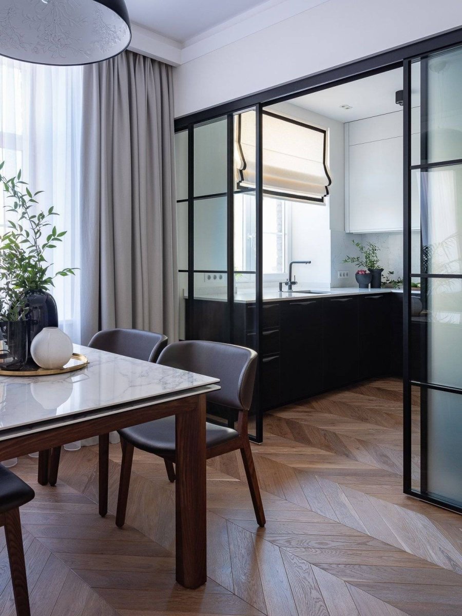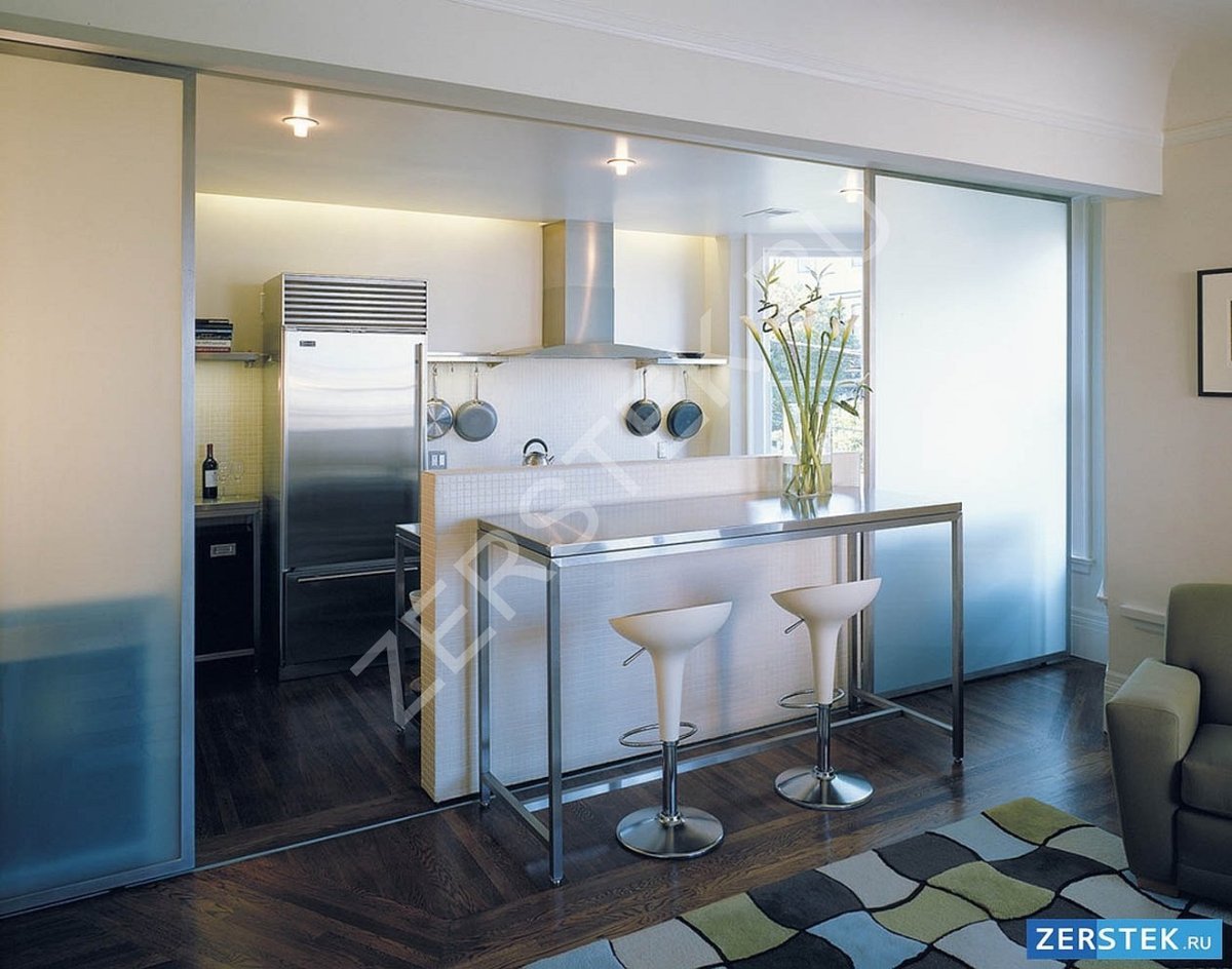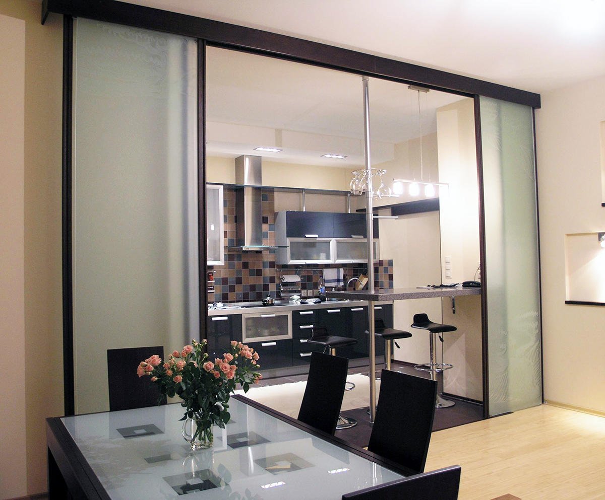 Раздвижная стеклянная перегородка между кухней и гостиной