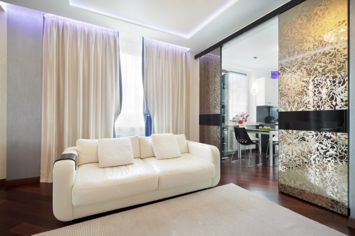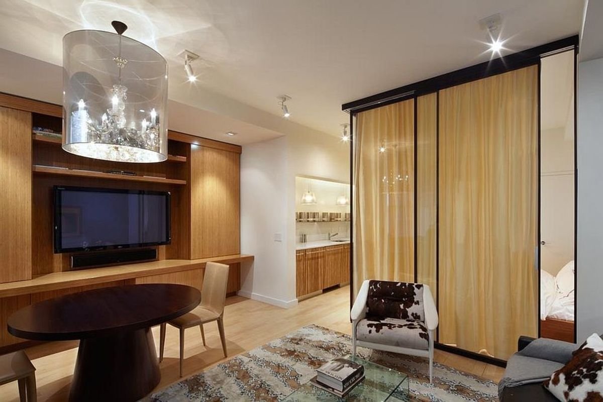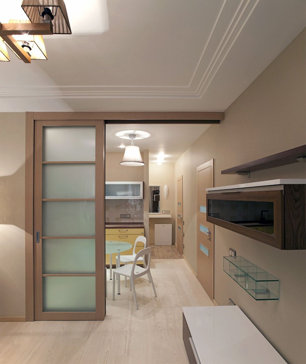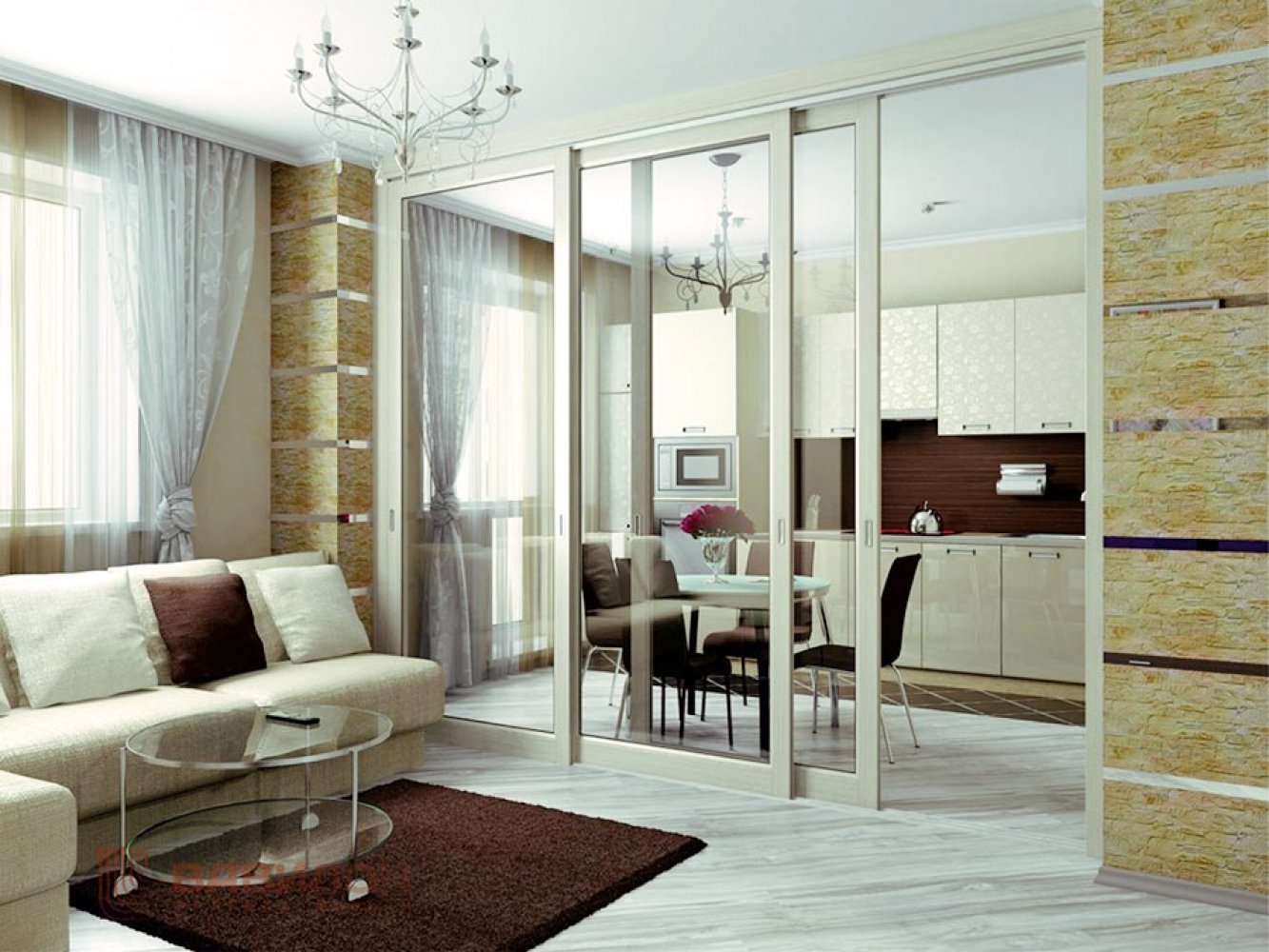 Маленькая кухня и гостиная с раздвижной перегородкой