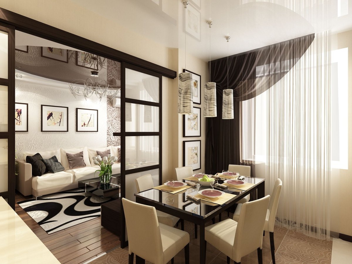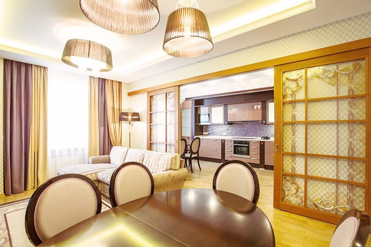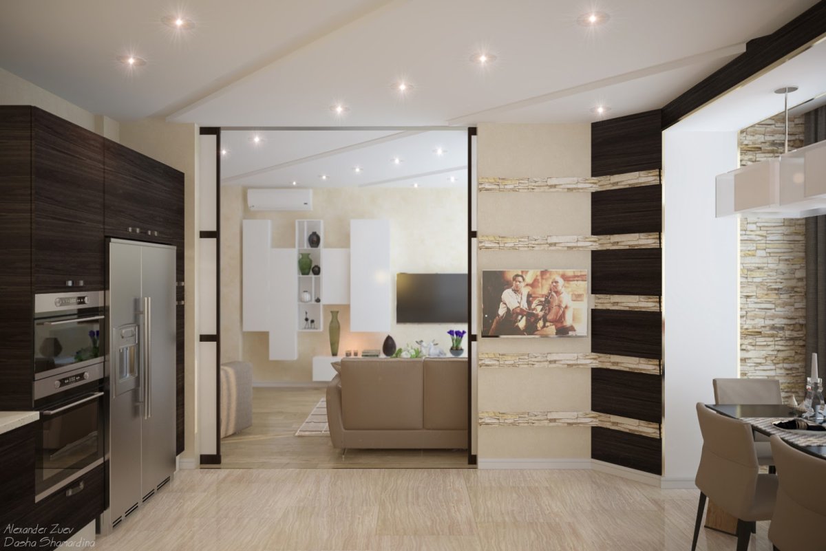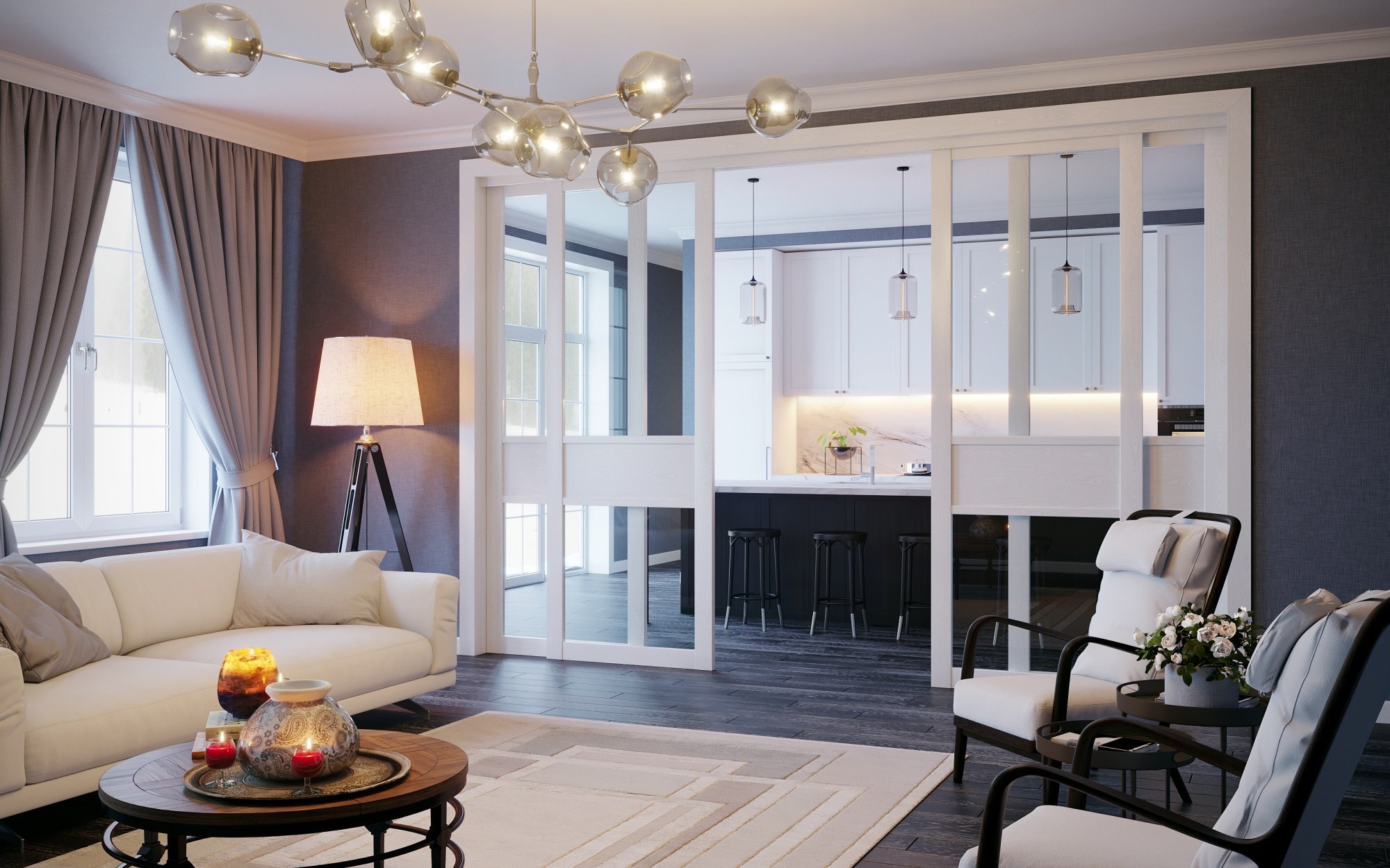 Маленькая кухня и гостиная с раздвижной перегородкой