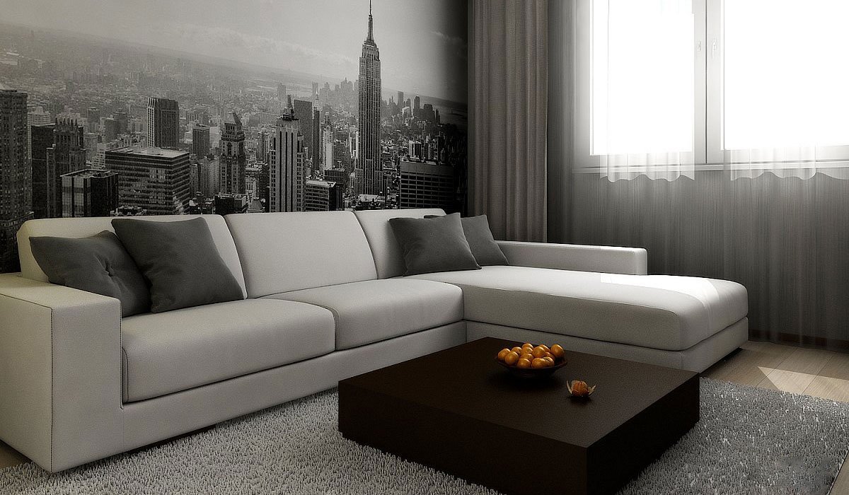 Комбинирование обоев в гостиной с угловым диваном