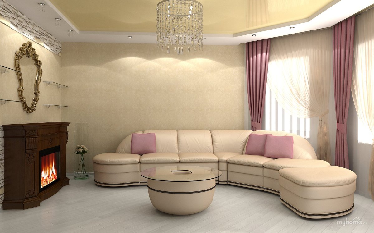 Интерьер гостиной с уговым дивано