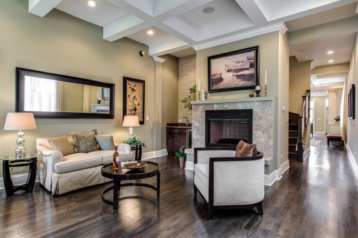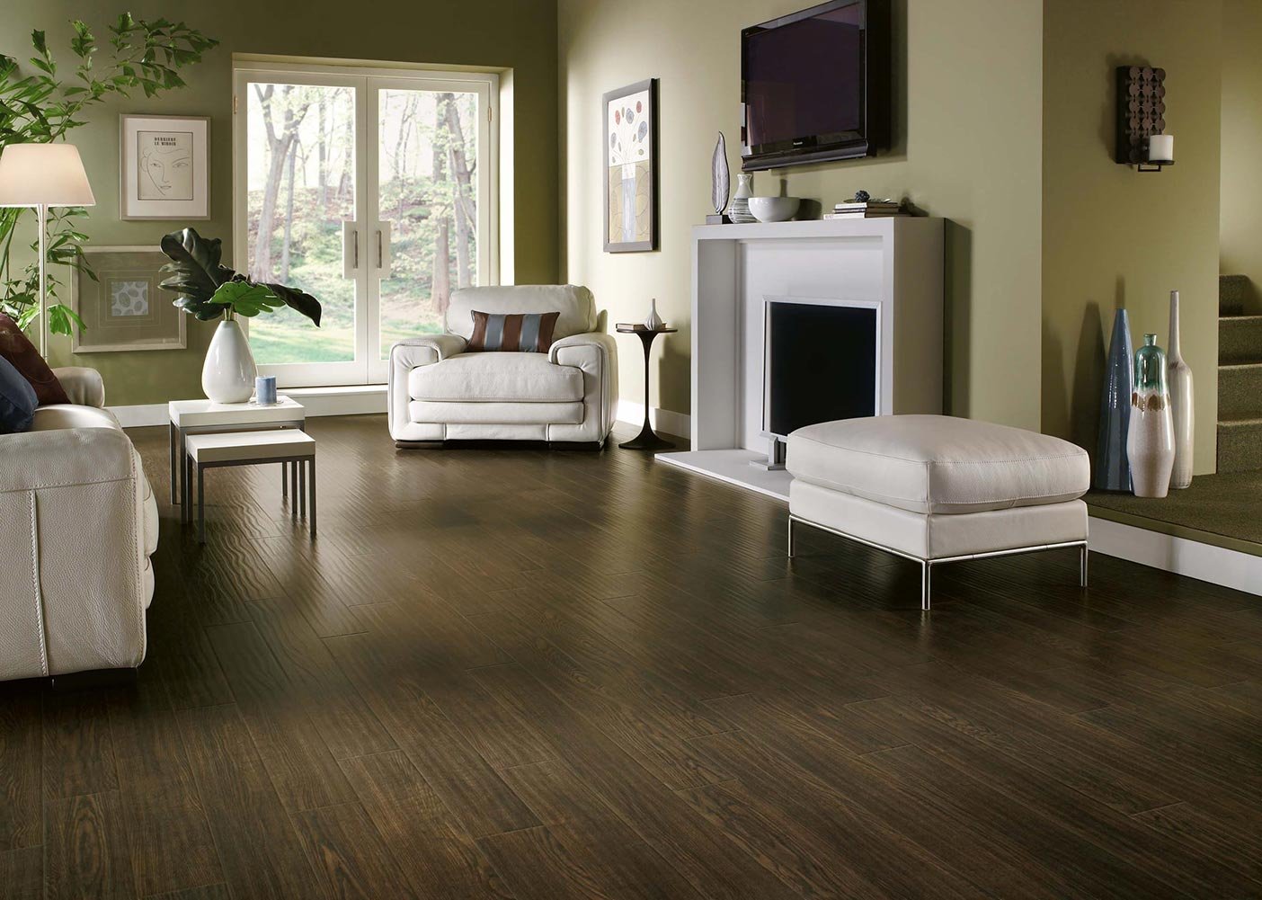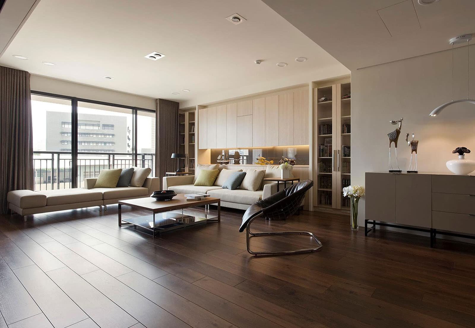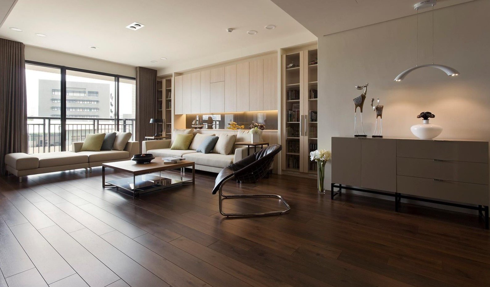 Темный ламинат в интерьере гостиной